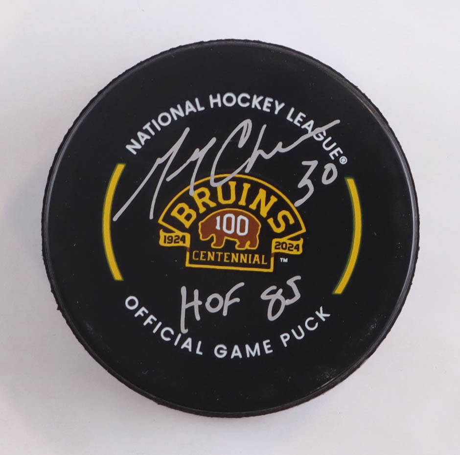 Boston Bruins logo hockey puck. Hand-signed and inscribed by Gerry Cheevers (HOF).