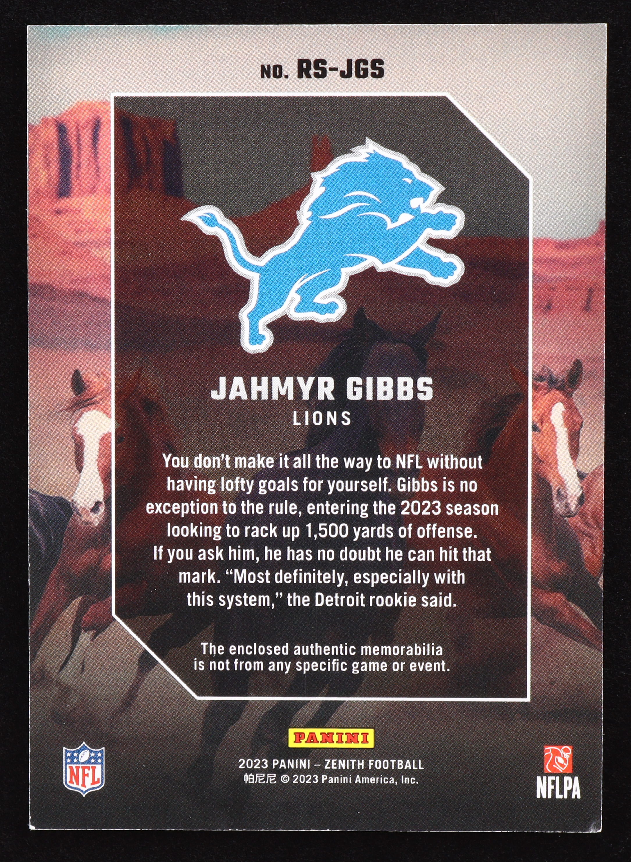 Jahmyr Gibbs 2023 Zenith Rookie Stallions Jerseys #13 RC