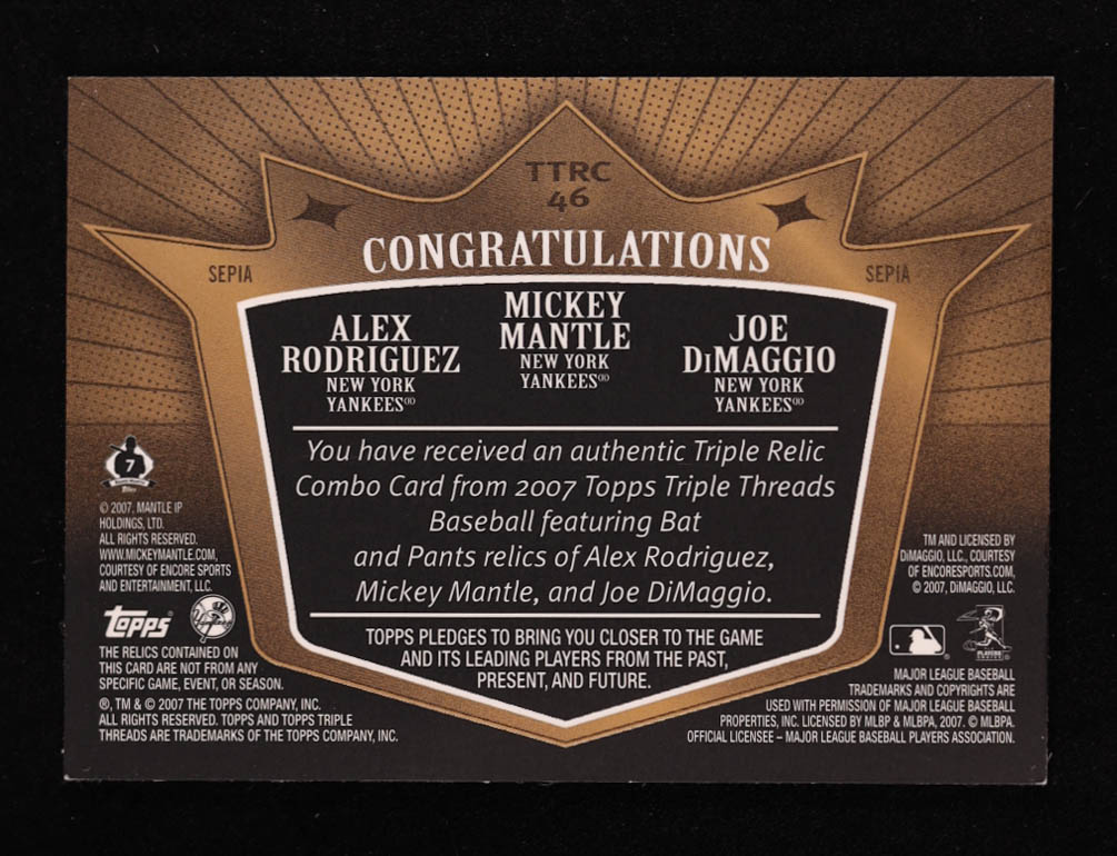 Joe DiMaggio / Mickey Mantle / Alex Rodriguez 2007 Topps Triple Threads Relics Combos Sepia #46 #19/27