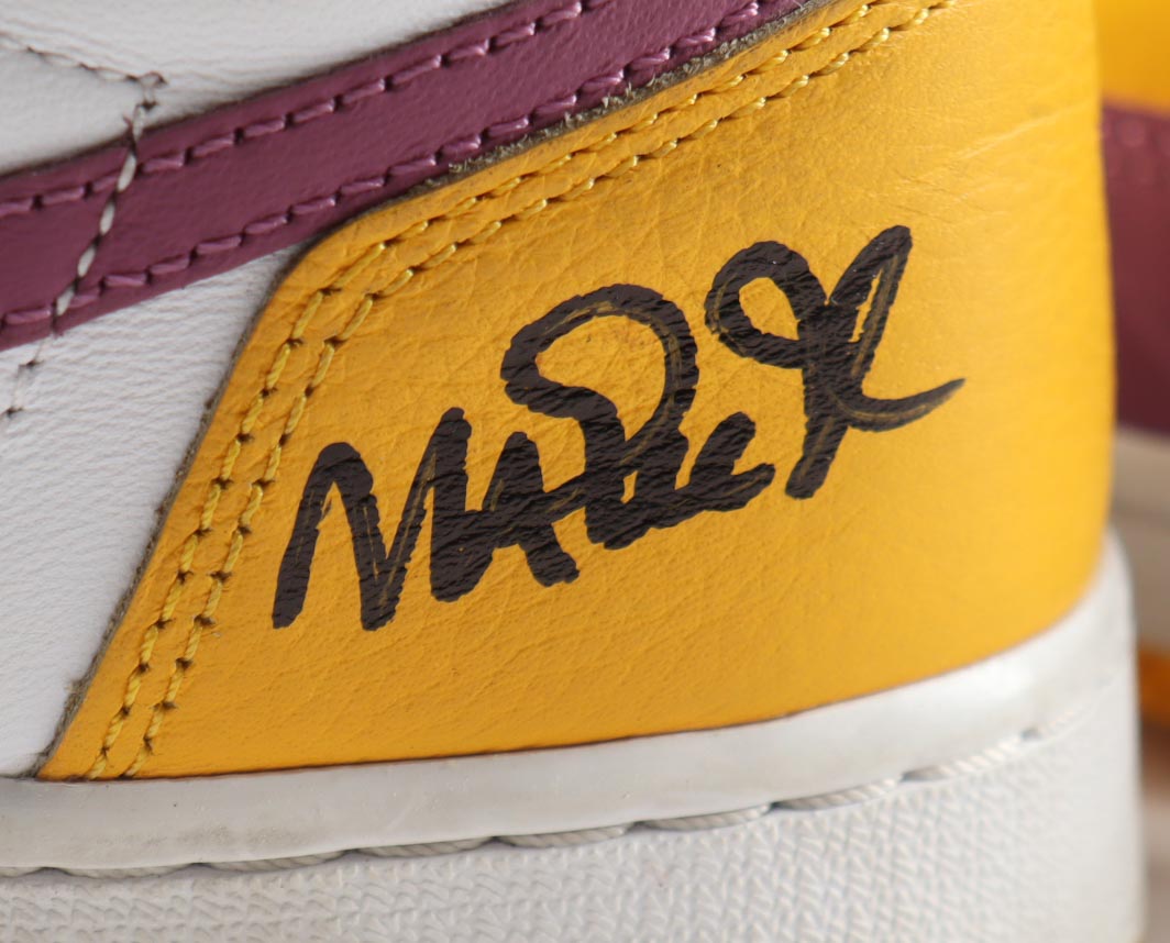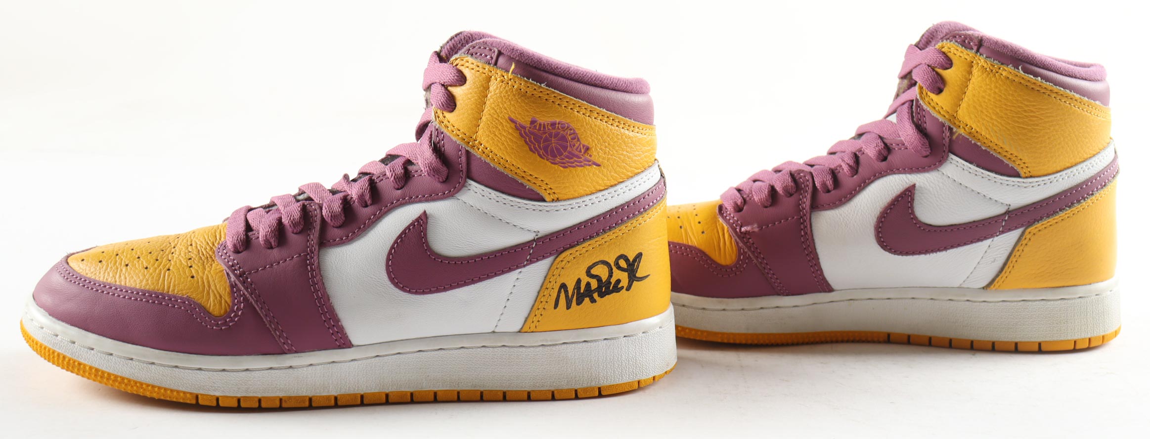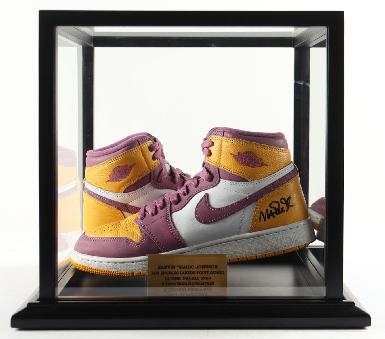 Pair of Nike Air Jordan Basketball Shoes. Hand-signed by Magic Johnson (Los Angeles Lakers, HOF). Please note, the pair of shoes has some staining, wear and scuffing. The display case is included as shown.