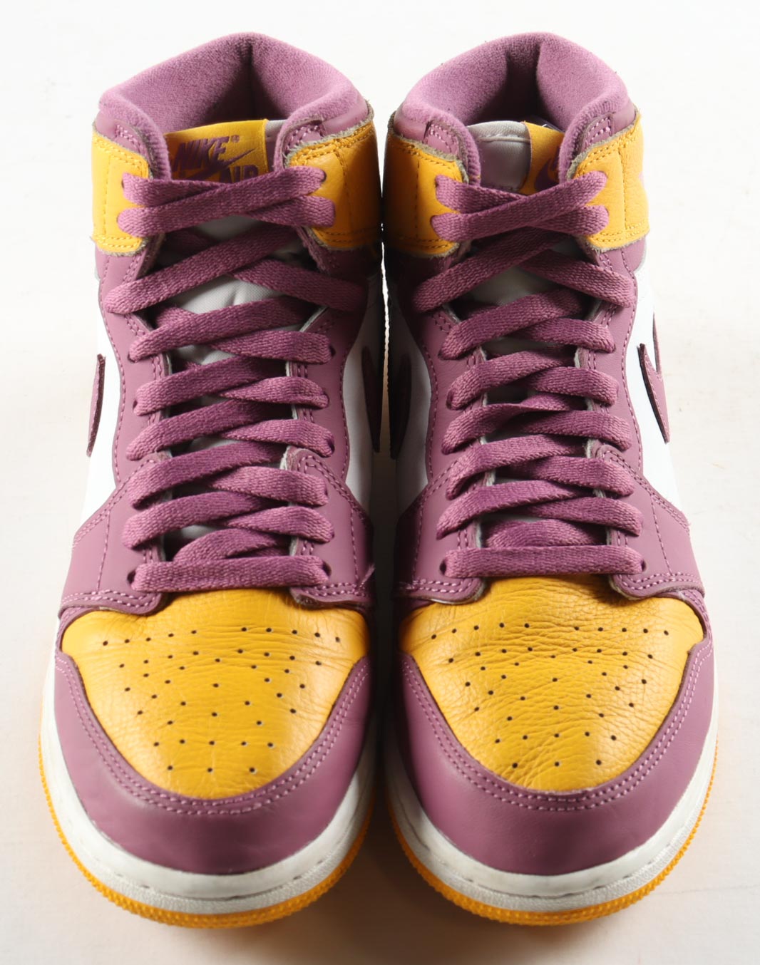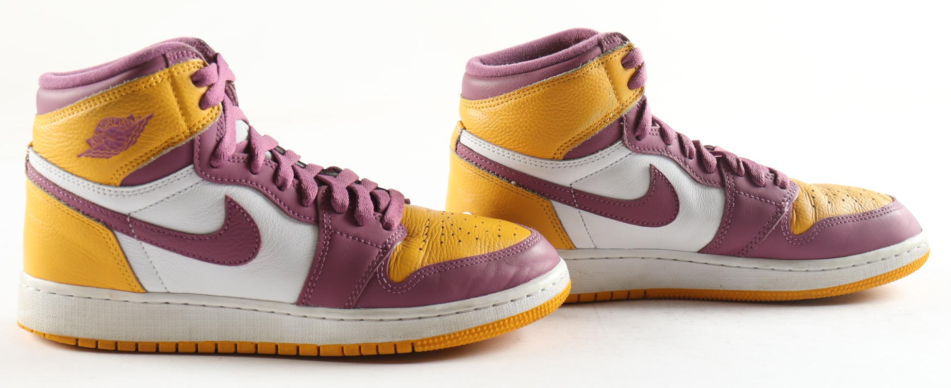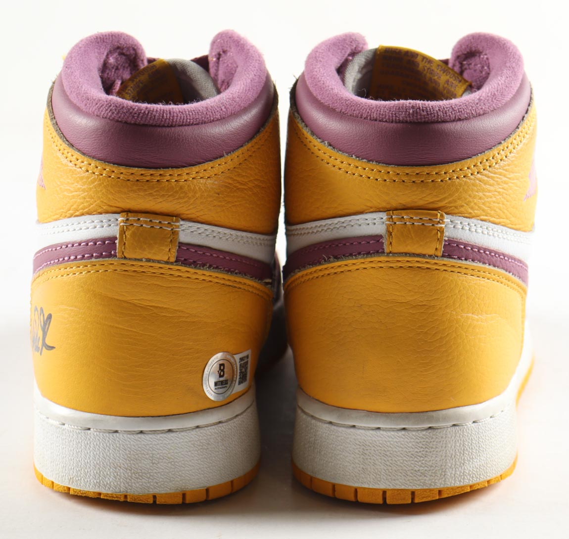 Pair of Nike Air Jordan Basketball Shoes. Hand-signed by Magic Johnson (Los Angeles Lakers, HOF). Please note, the pair of shoes has some staining, wear and scuffing. The display case is included as shown.