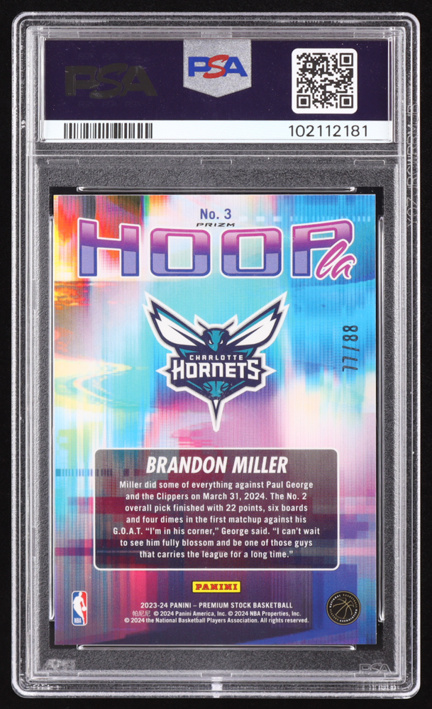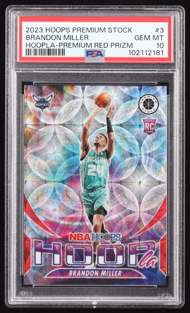 Brandon Miller 2023-24 Hoops Premium Stock Hoopla Premium Red Prizm #3 #77/88 RC (PSA 10)