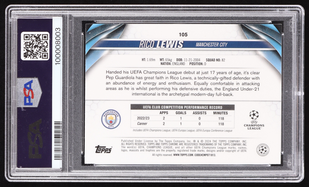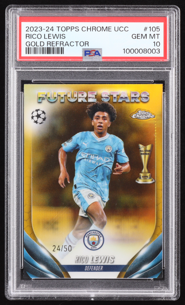 Rico Lewis 2023-24 Topps Chrome UEFA Club Competitions Geometic Gold Refractors #105 #24/50 (PSA 10)