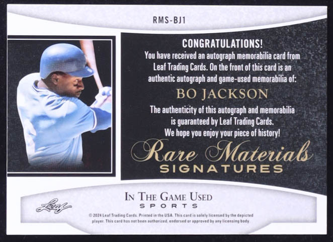 Bo Jackson 2024 Leaf ITG Game Used Rare Materials Signatures Red #RMSR1 #3/4