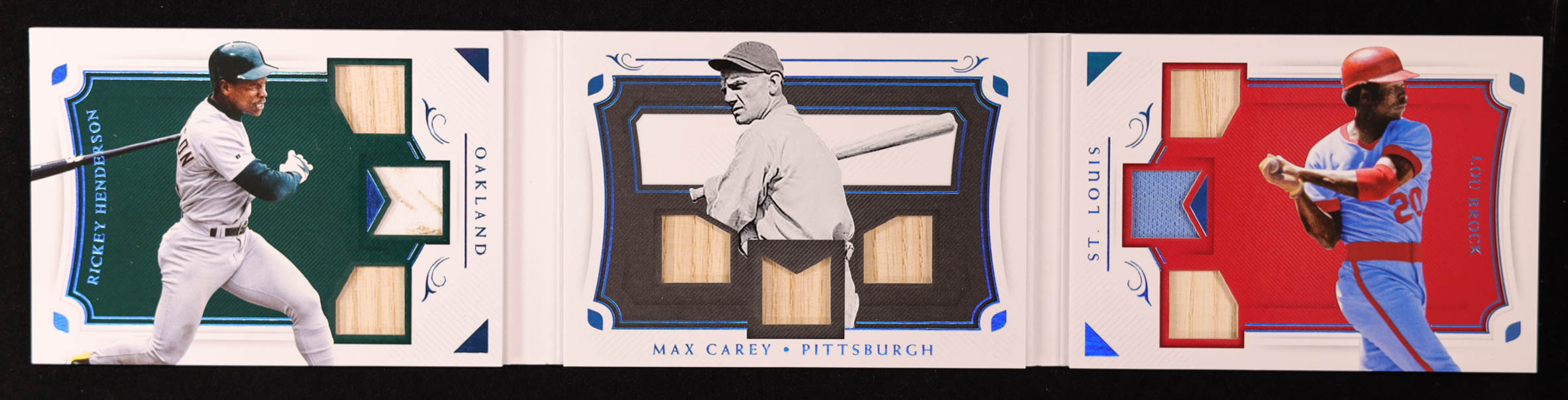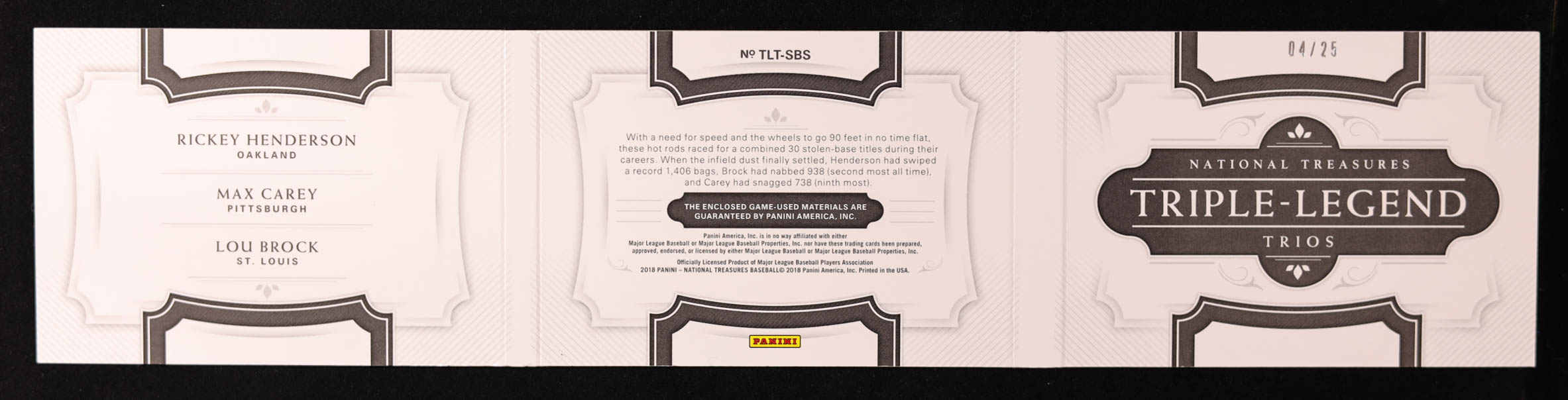 Lou Brock / Max Carey / Rickey Henderson 2018 Panini National Treasures Triple Legend Trios Booklets #6 #04/25