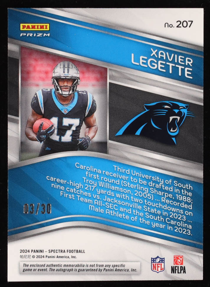 Xavier Legette 2024 Panini Spectra Neon Purple #207 Jersey Autograph #03/30 RC