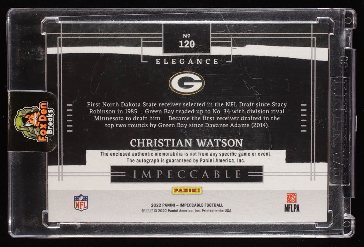 Christian Watson 2022 Panini Impeccable Elegance Rookie Helmet and Nameplate Autographs #120 #11/35 RC