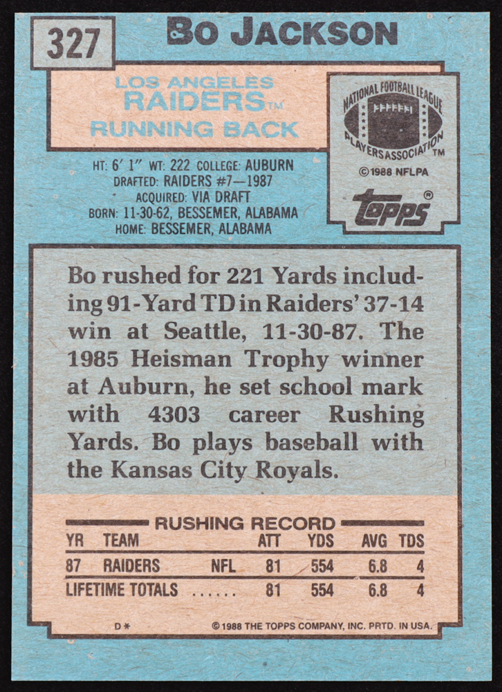 Bo Jackson 1988 Topps #327 SR RC