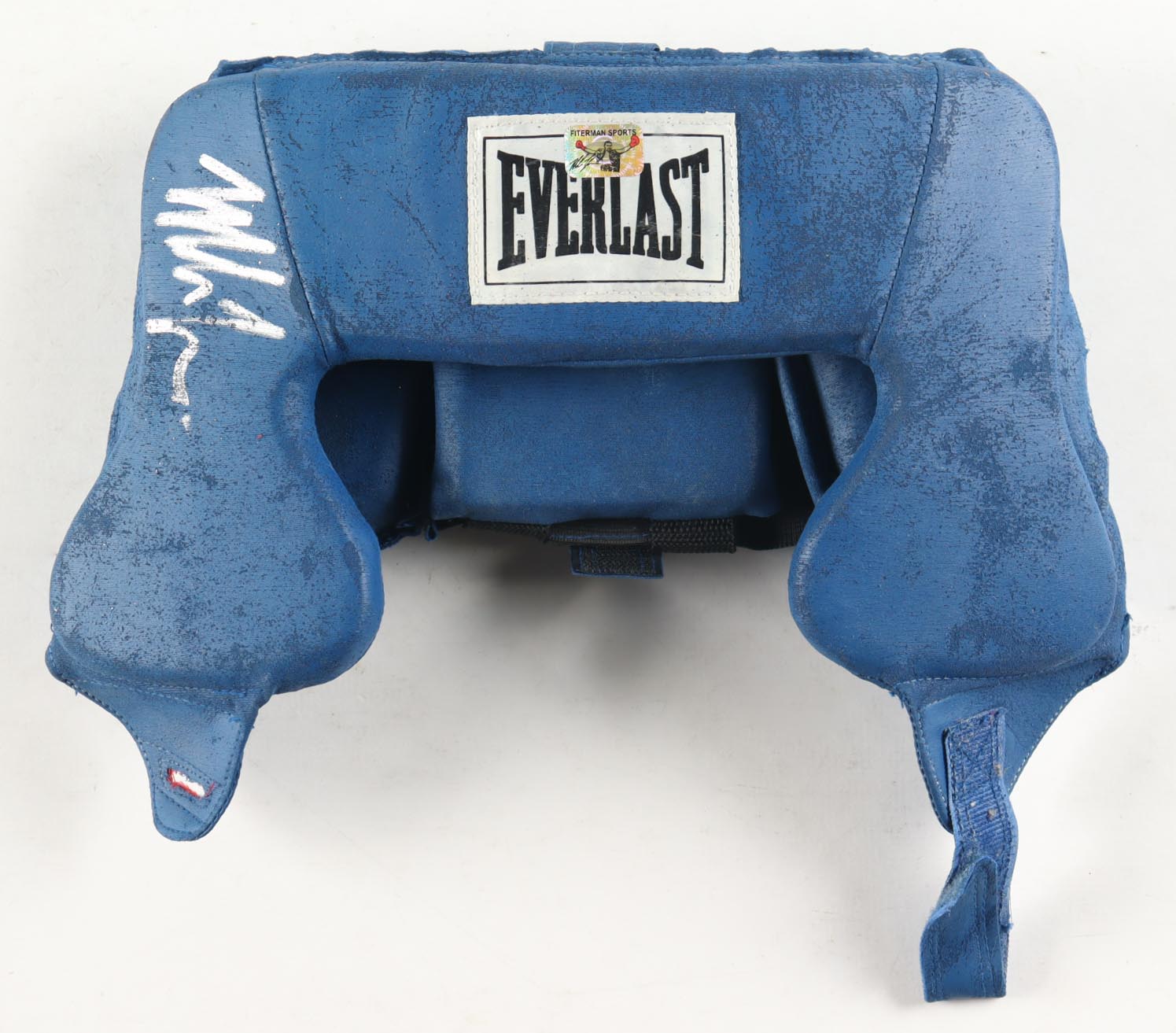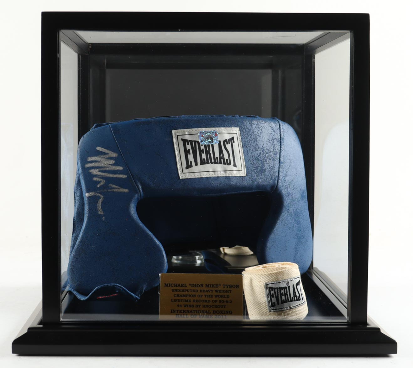Everlast boxing head gear. Hand-signed by Mike Tyson (HOF). The display case and wrist wraps are included as shown.