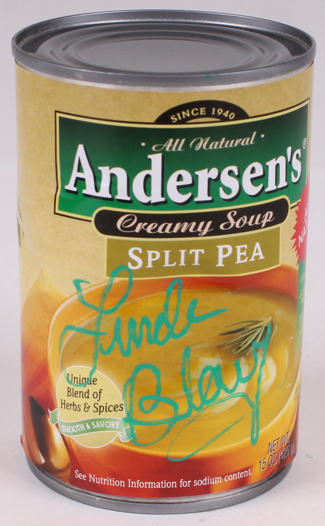 Split pea soup can measures 4" in height and has been hand-signed in green paint pen by Linda Blair (The Exorcist). Please note, the can is dented.