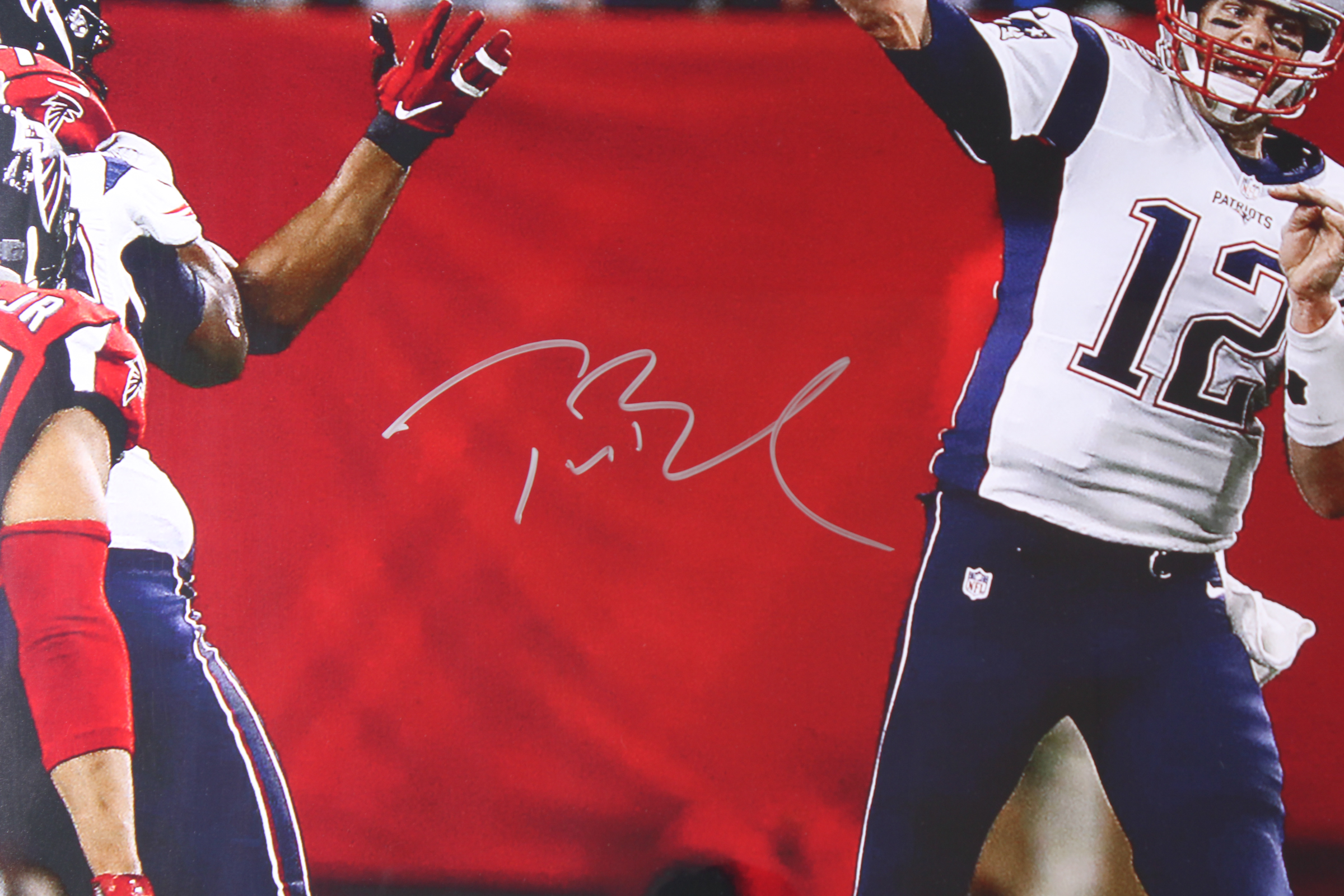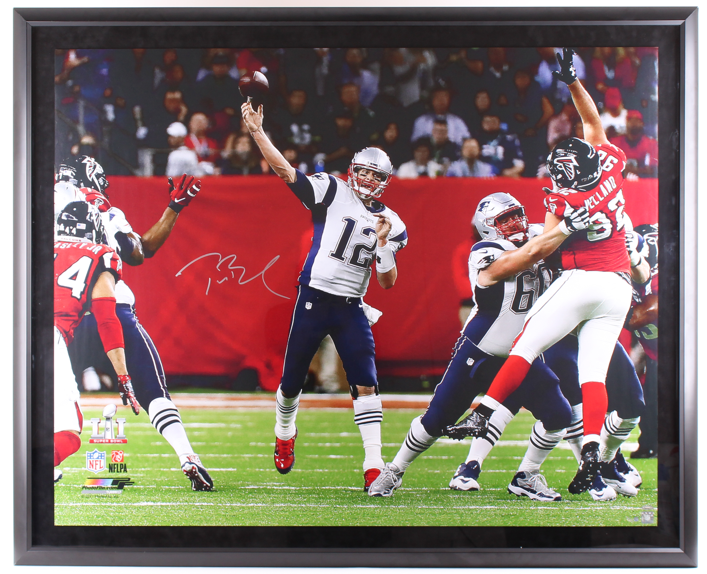 Custom framed photo display measures approximately 46" x 56" in size and has been hand-signed in silver paint pen by Tom Brady. The photo is a limited edition and has been numbered #1 /12.
