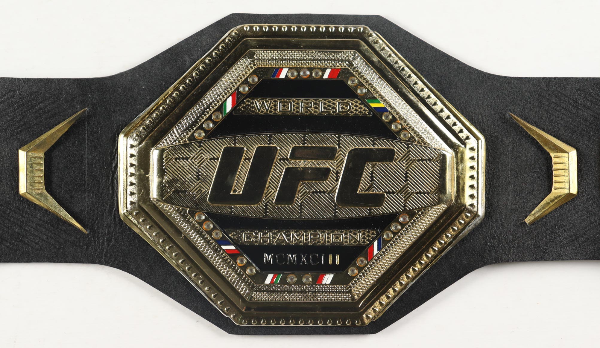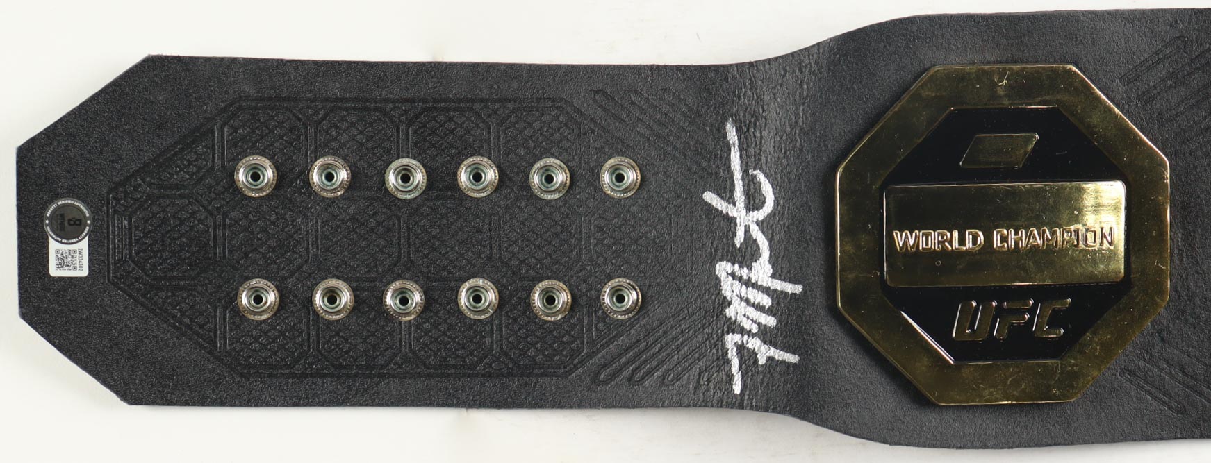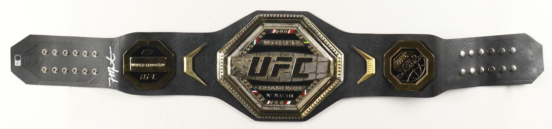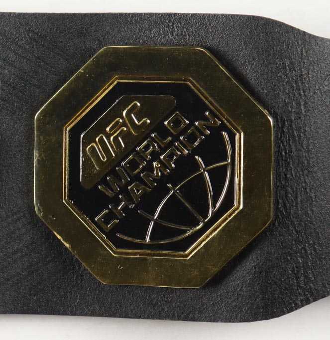 This full-size high-quality replica belt is faux leather and features metal plates. Hand-signed by Aljamain Sterling.