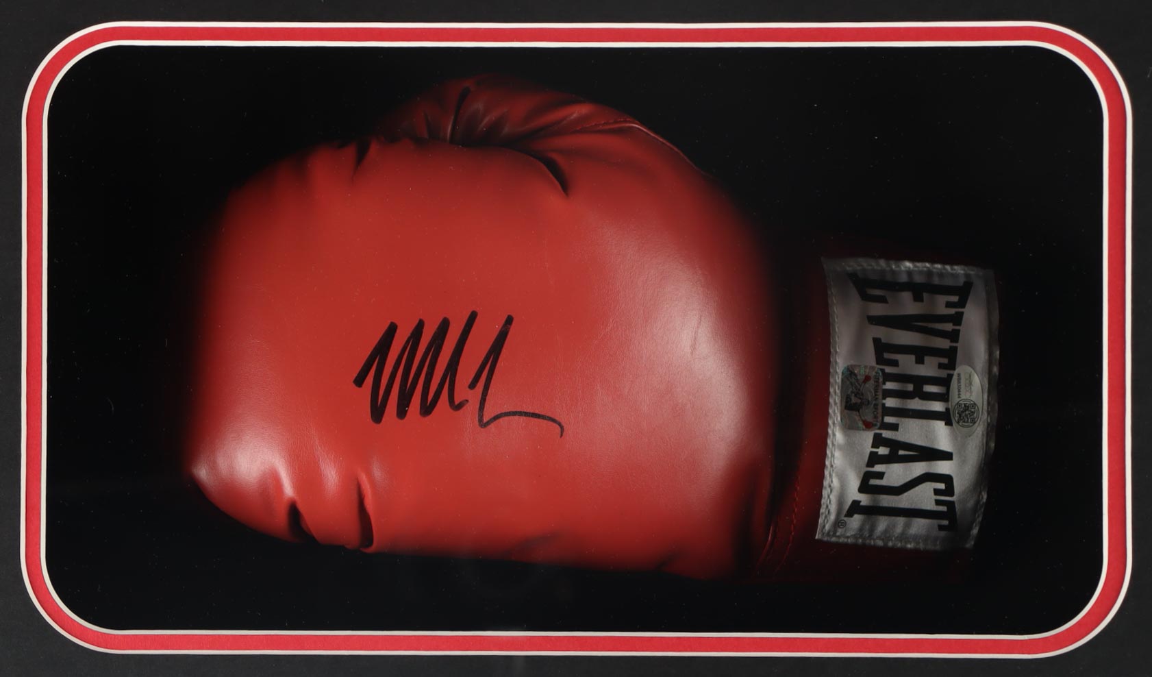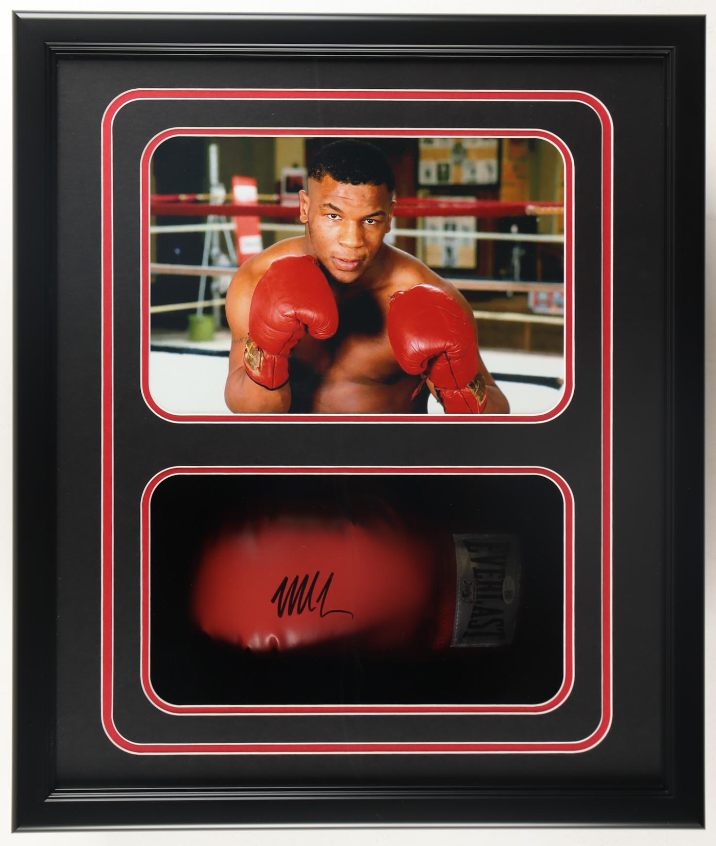 Custom shadowbox measures 22" x 27" x 6.5" in size and features an Everlast boxing glove that has been hand-signed by Mike Tyson (HOF). Please note, the photo is unsigned.