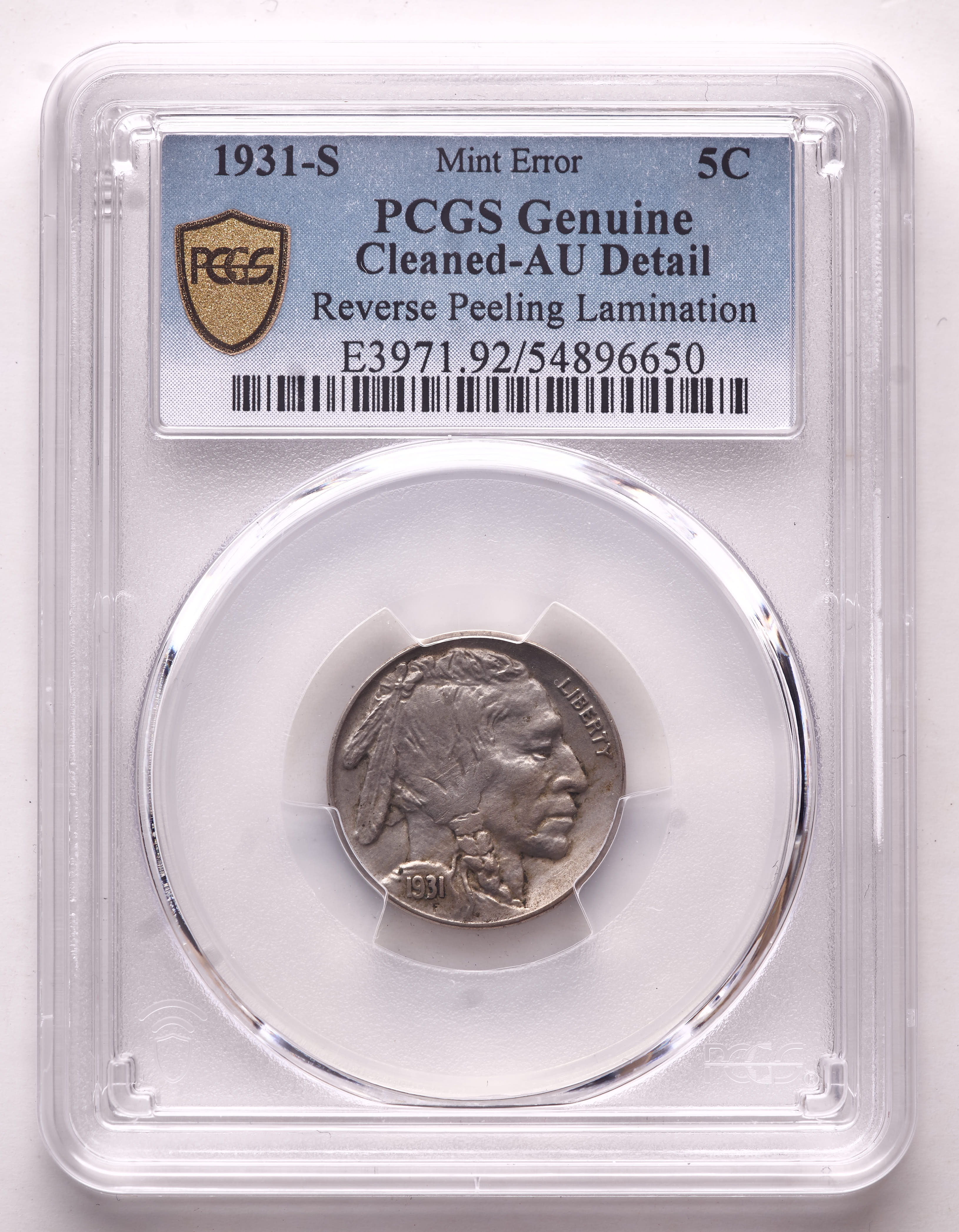 Mint Error 1931-S Buffalo Nickel Reverse Peeling Laminations (PCGS AU Details)