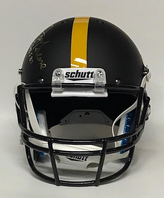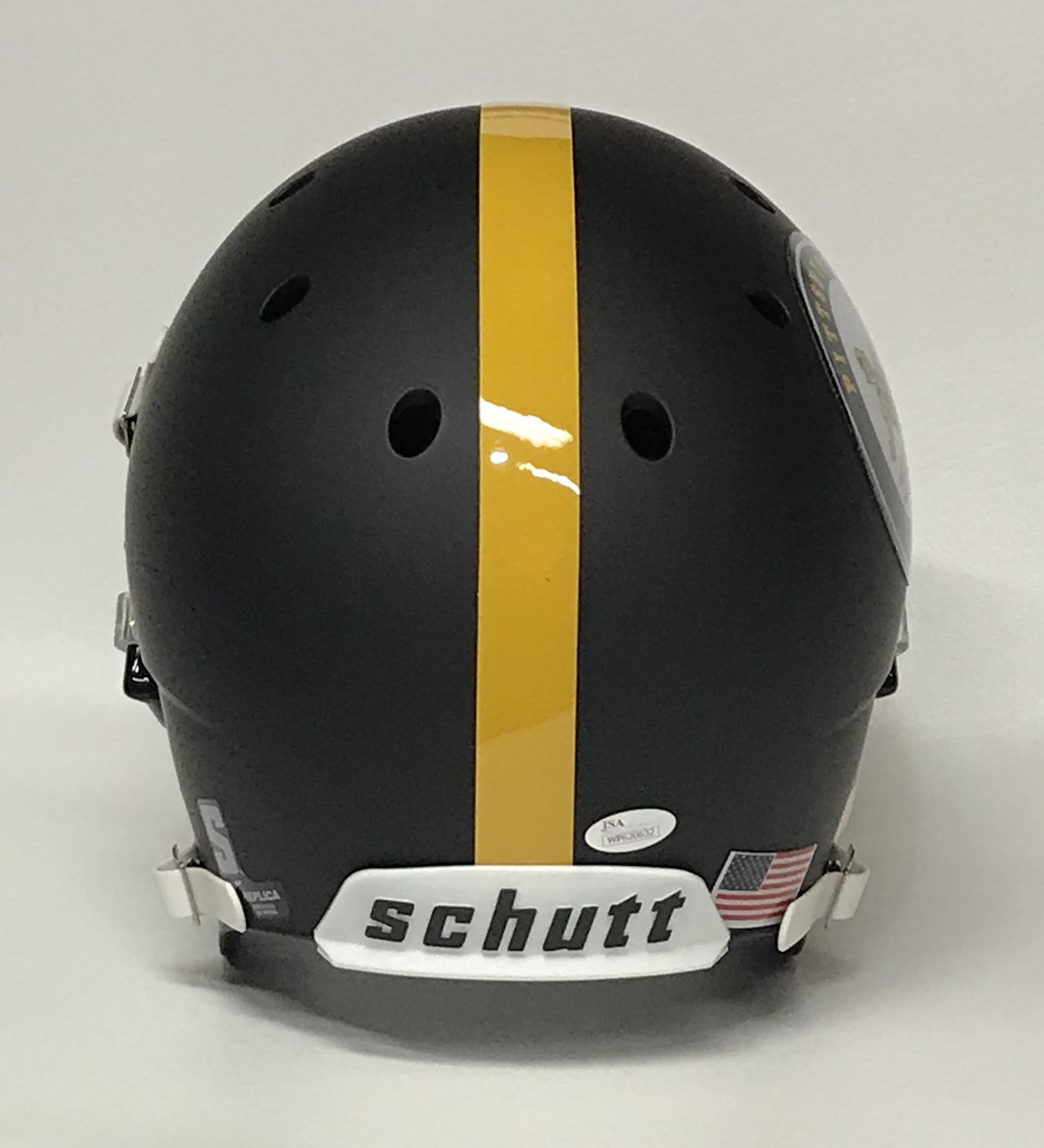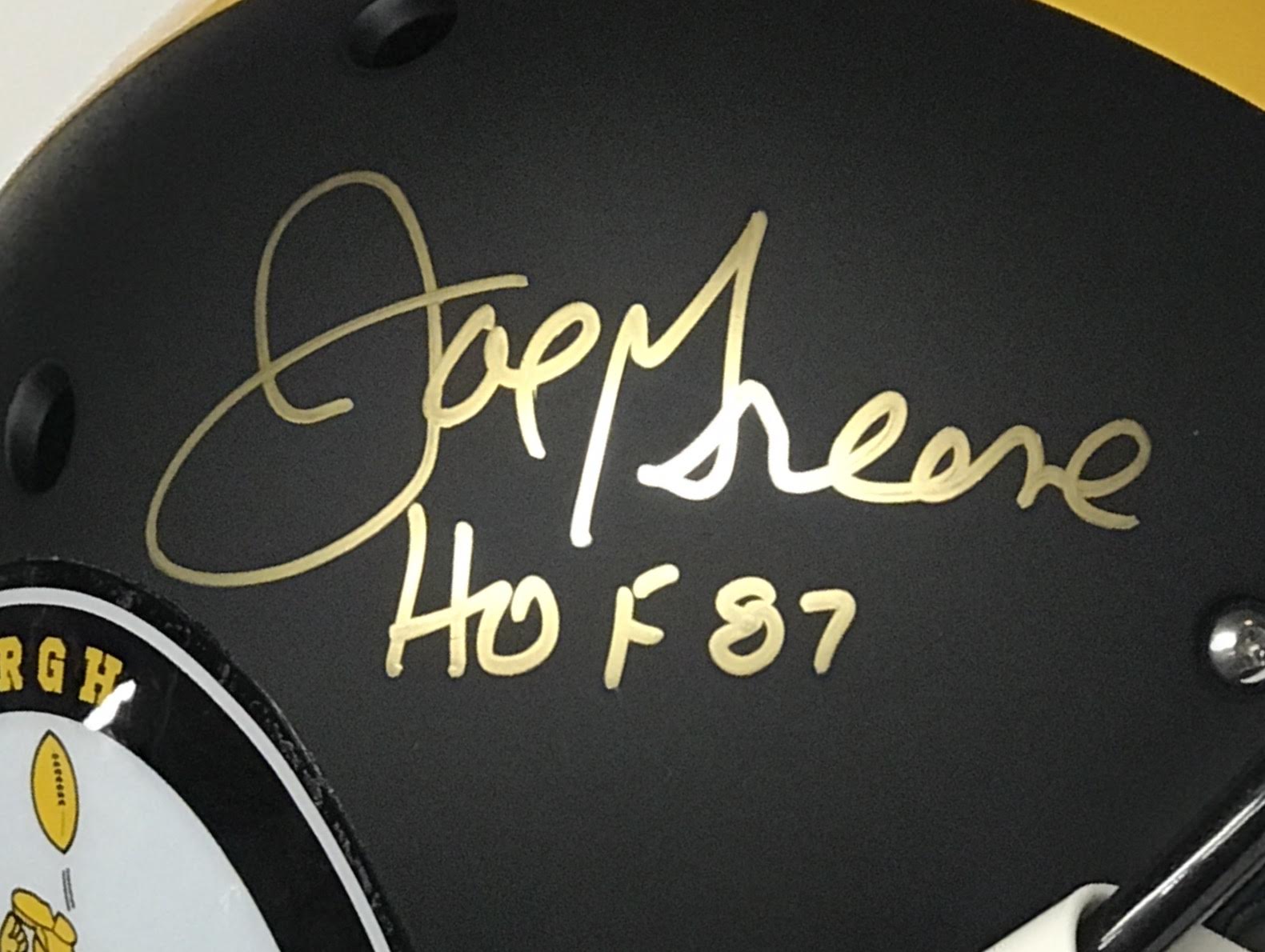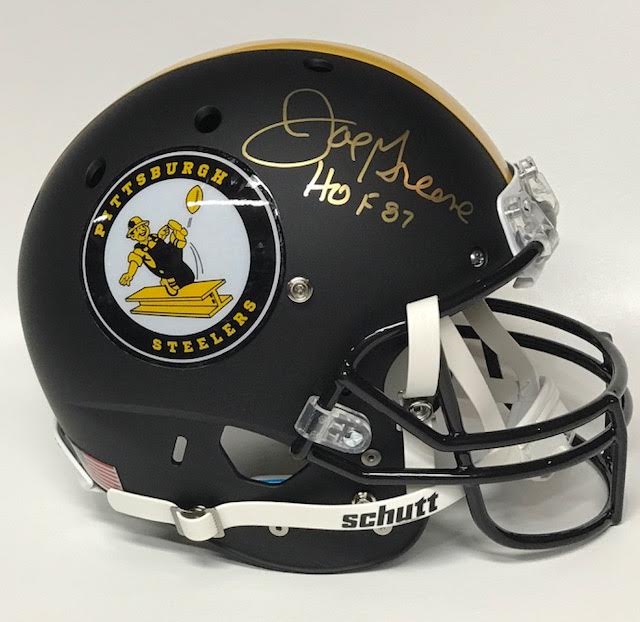 Schutt Steelers throwback custom matte black full-size replica helmet. Hand-signed and inscribed in gold paint pen by Joe Greene (HOF).