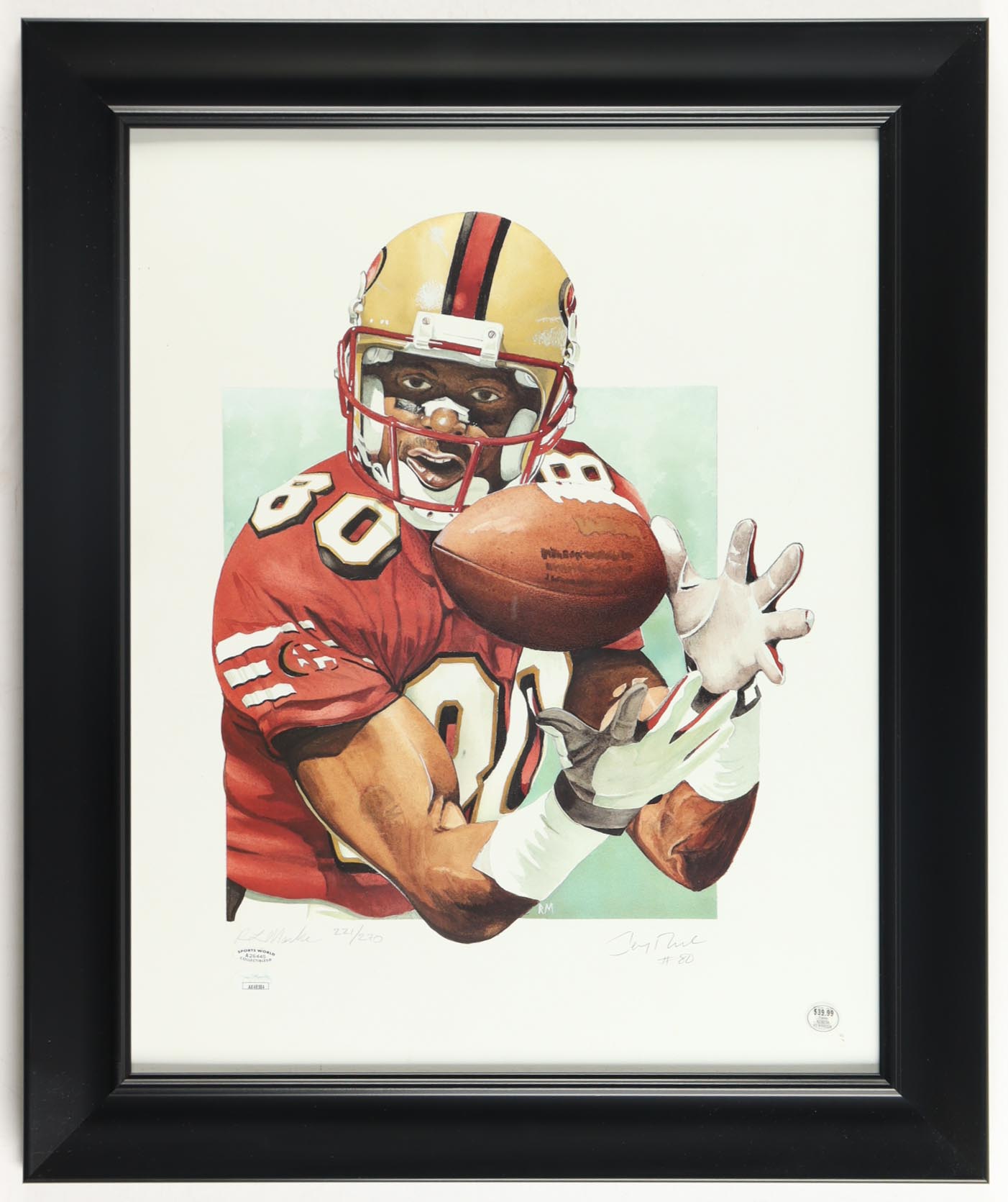Custom frame measures approximately 20" x 24" in size and features a lithograph that has been hand-signed by Jerry Rice (San Francisco 49ers, HOF).