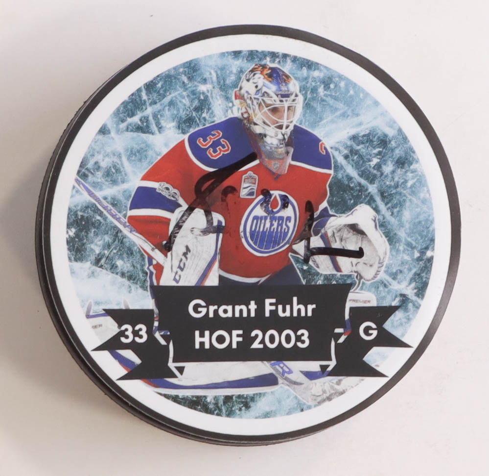 2003 Hall of Fame Logo Hockey Puck. Hand-signed by Grant Fuhr (Edmonton Oilers, HOF). See photos for more details on condition of the signature.