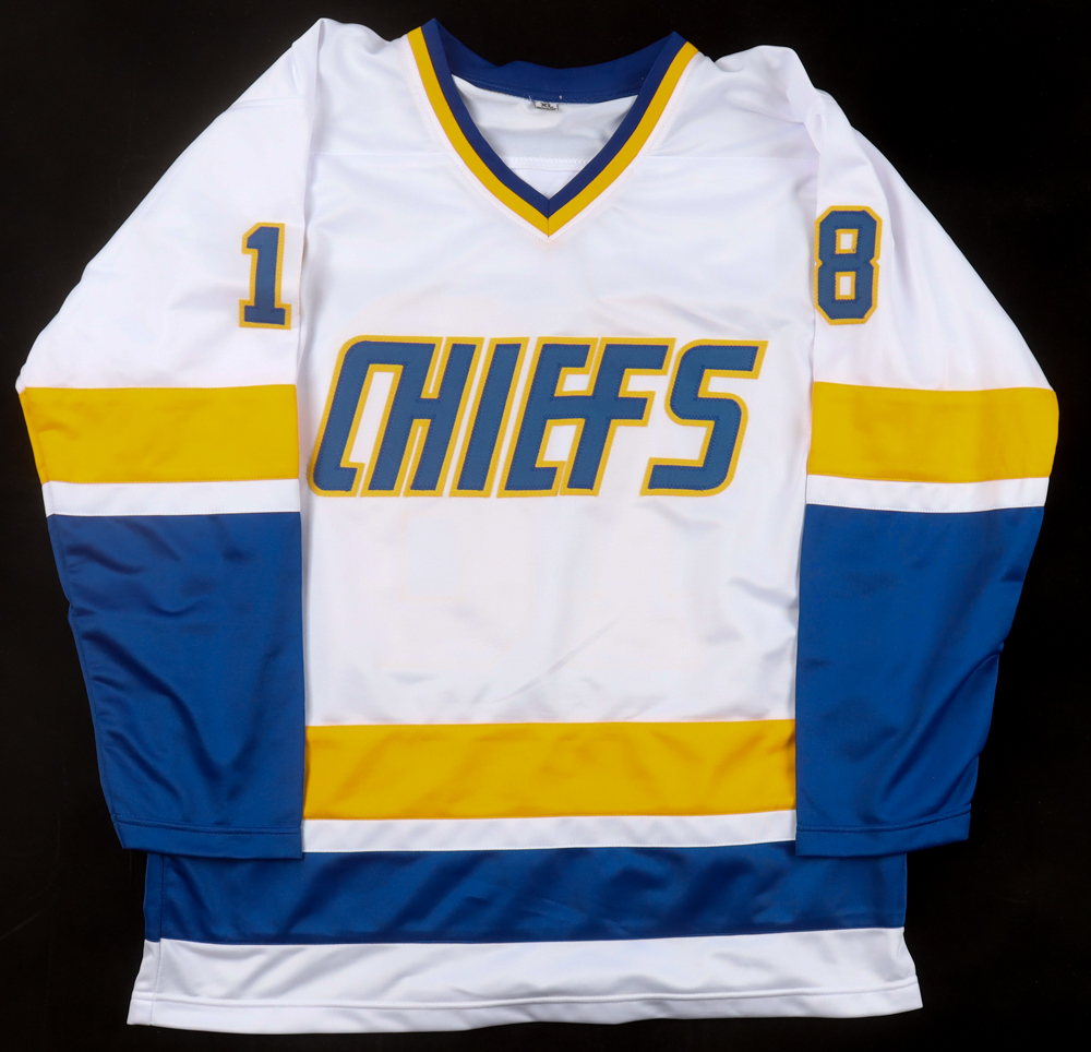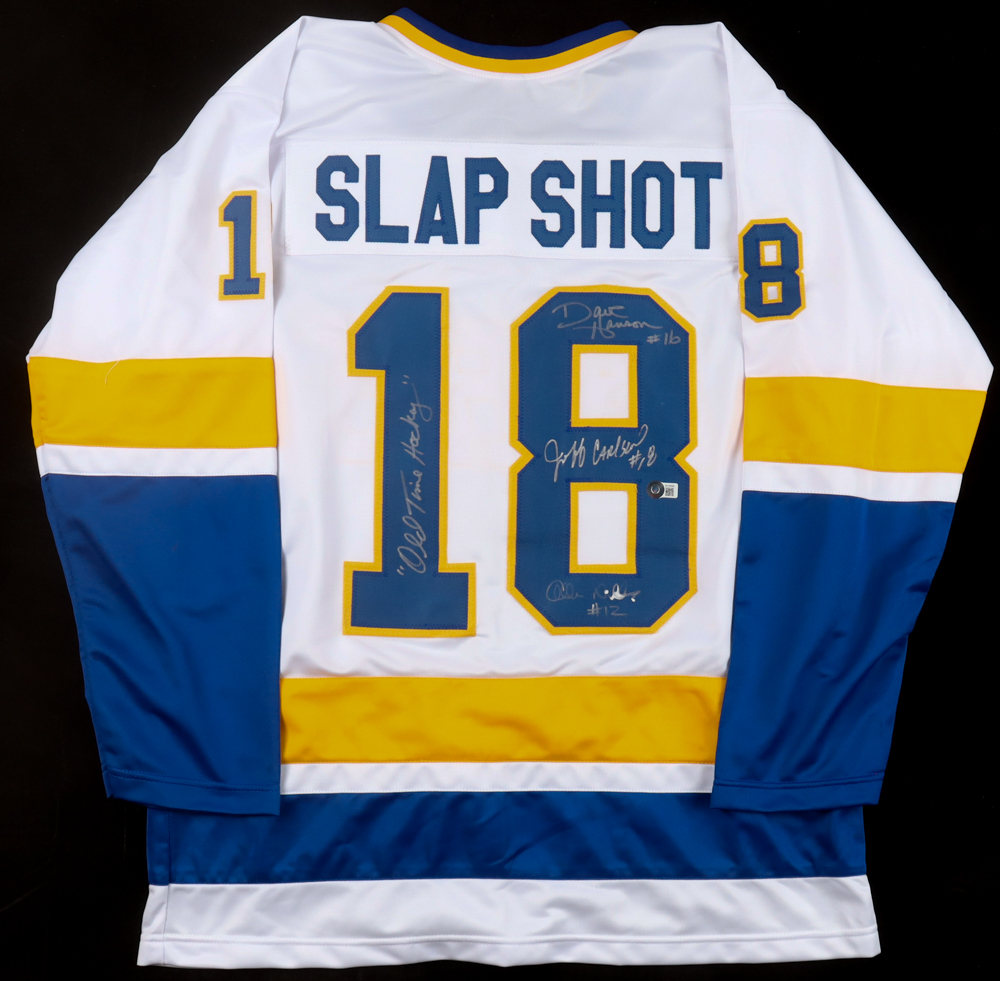 Custom jersey. Everything is sewn on, size XL. Hand-signed and inscribed by Dave Hanson, Allan Nicholls, and Jeff Carlson (The Hanson Brothers).