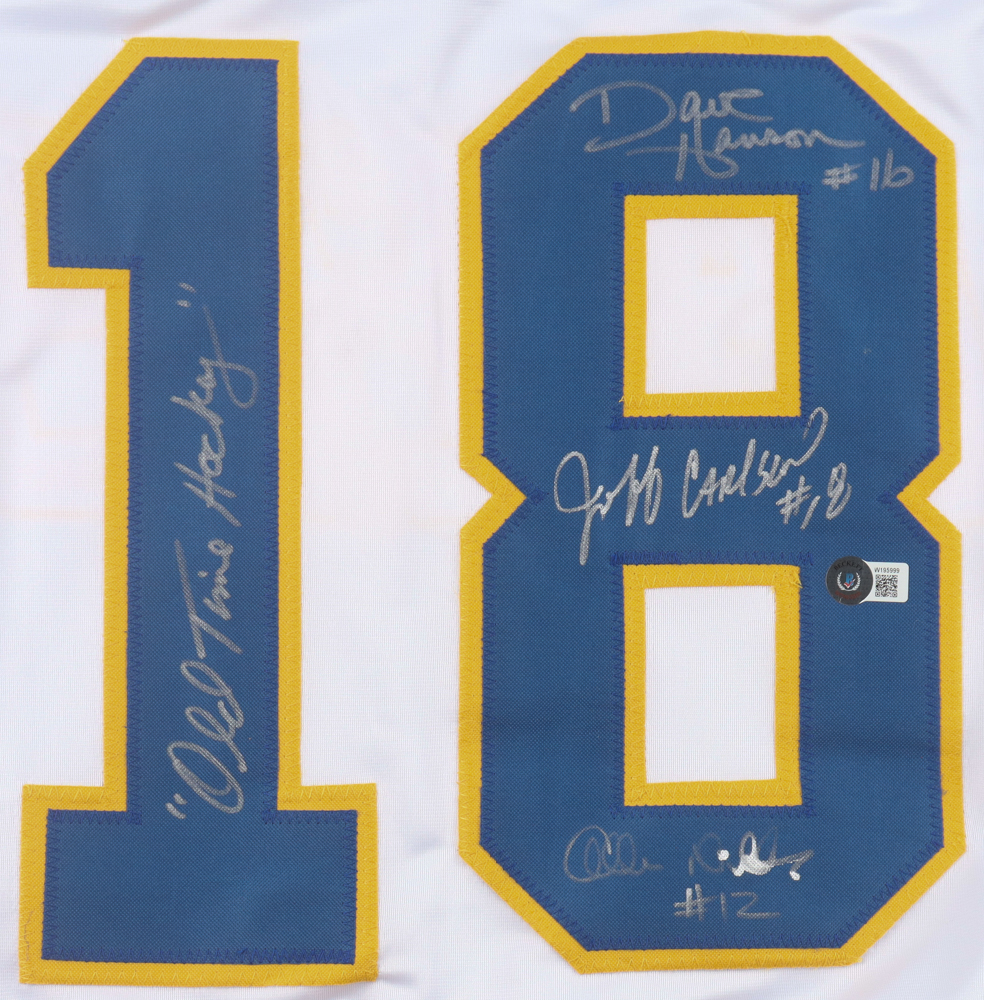 Dave Hanson, Allan Nicholls, & Jeff Carlson Signed Jersey Inscribed "Old Time Hockey" (Beckett)