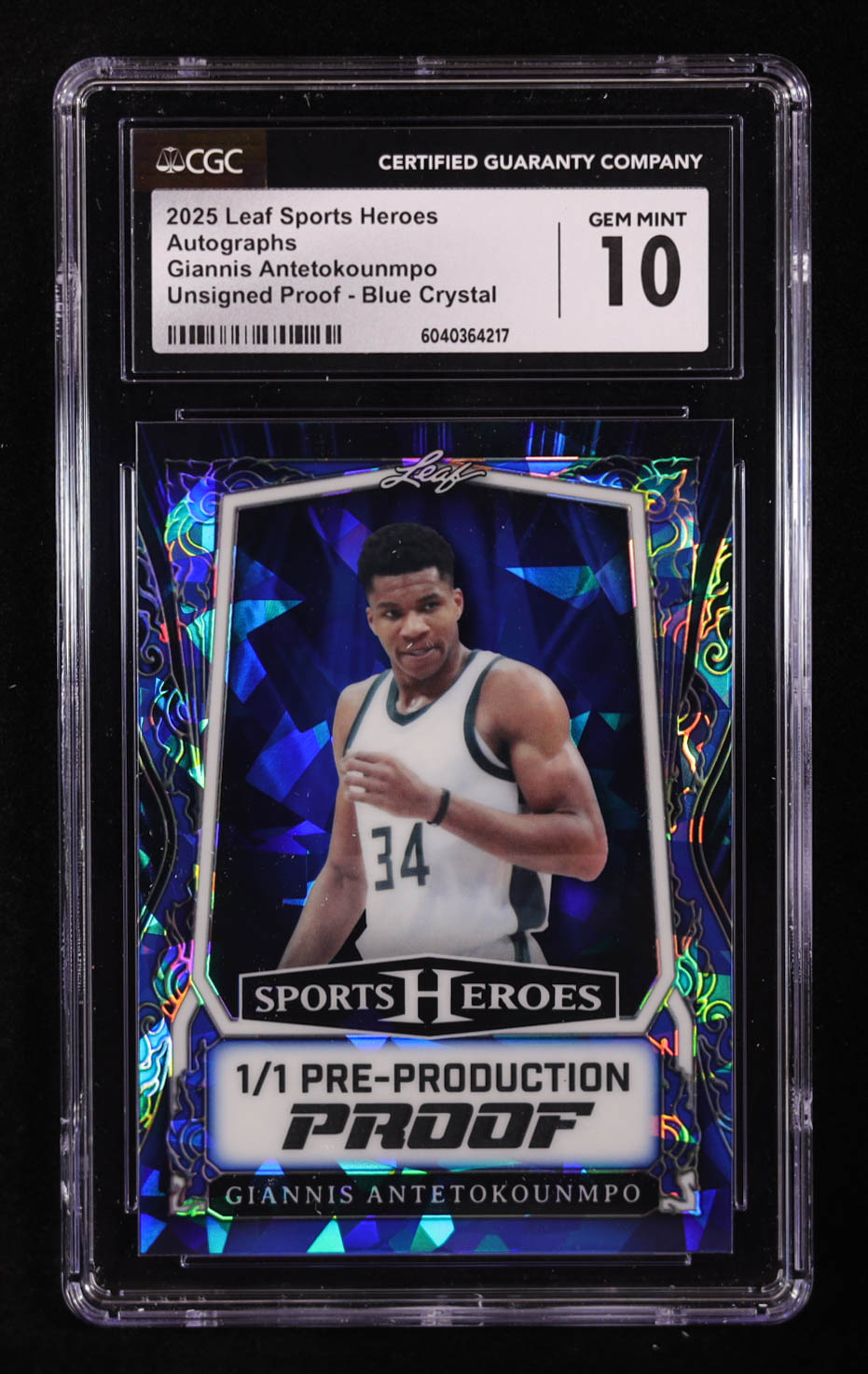 Giannis Antetokounmpo 2025 Leaf Sports Heroes Blue Crystal Pre-Production Proof #1/1 (CGC 10)