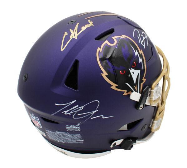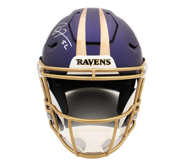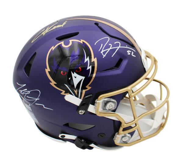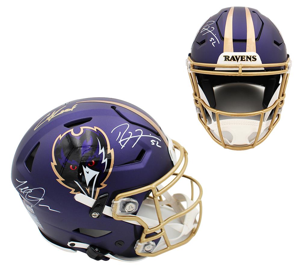 Riddell Baltimore Ravens full-size authentic on-field alternate speedflex helmet. Hand-signed by Ray Lewis (HOF), Ed Reed (HOF), and Terrell Suggs.
