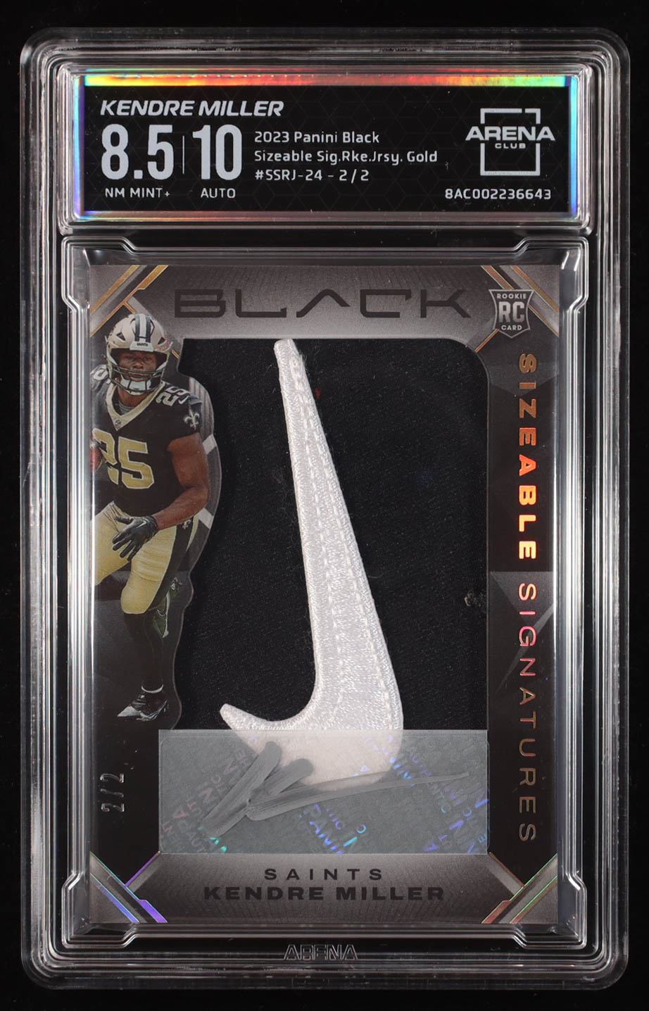 Kendre Miller Signed 2023 Panini Black Sizeable Rookie Jersey Signatures Gold #24 #2/2 RC (Arena Club 8.5)