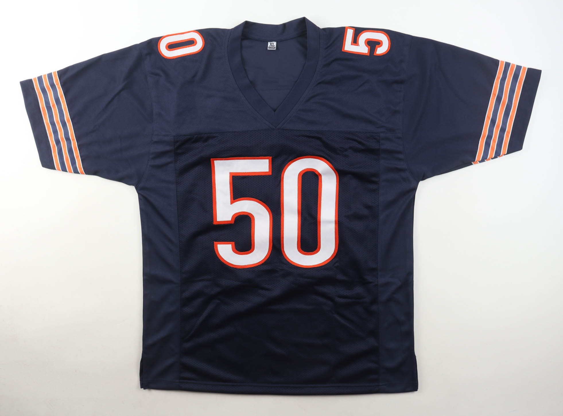 Custom jersey with everything sewn on, size XL. Hand-signed and inscribed by Mike Singletary (HOF). Please note, the signature and inscription has bled.