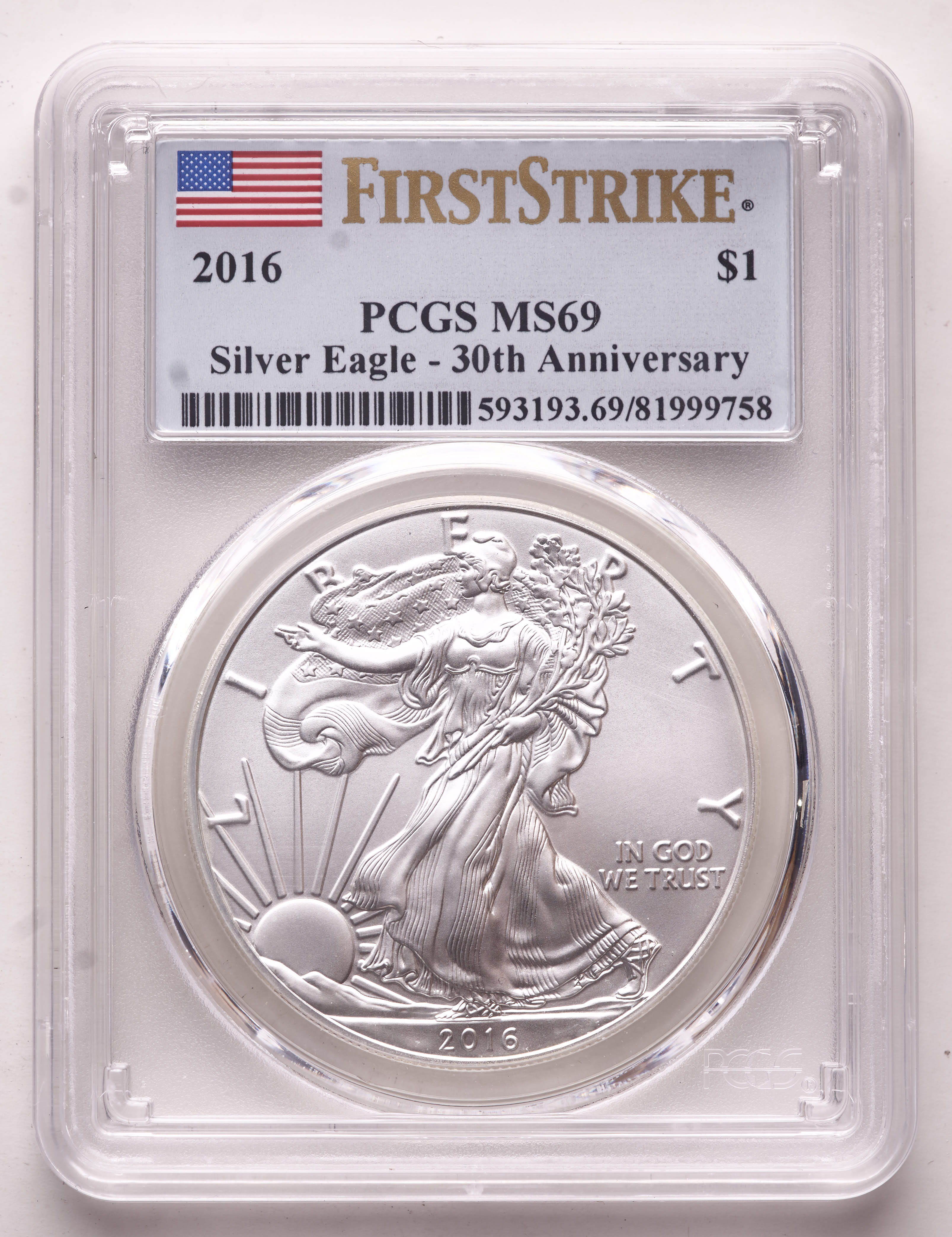 2016 American Silver Eagle $1 One Dollar Coin - First Strike, 30th Anniversary (PCGS MS69)