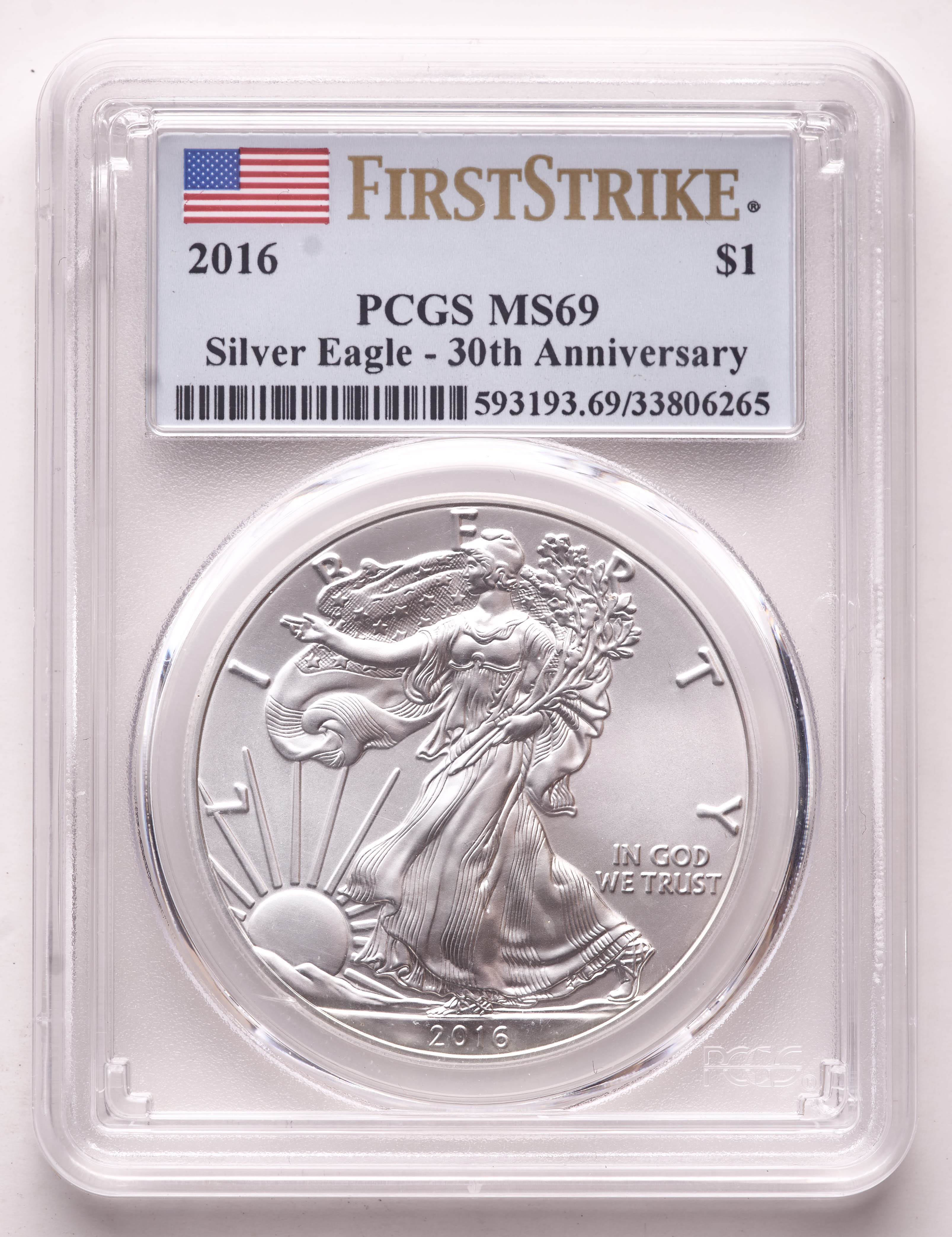 2016 American Silver Eagle $1 One Dollar Coin - First Strike, 30th Anniversary (PCGS MS69)