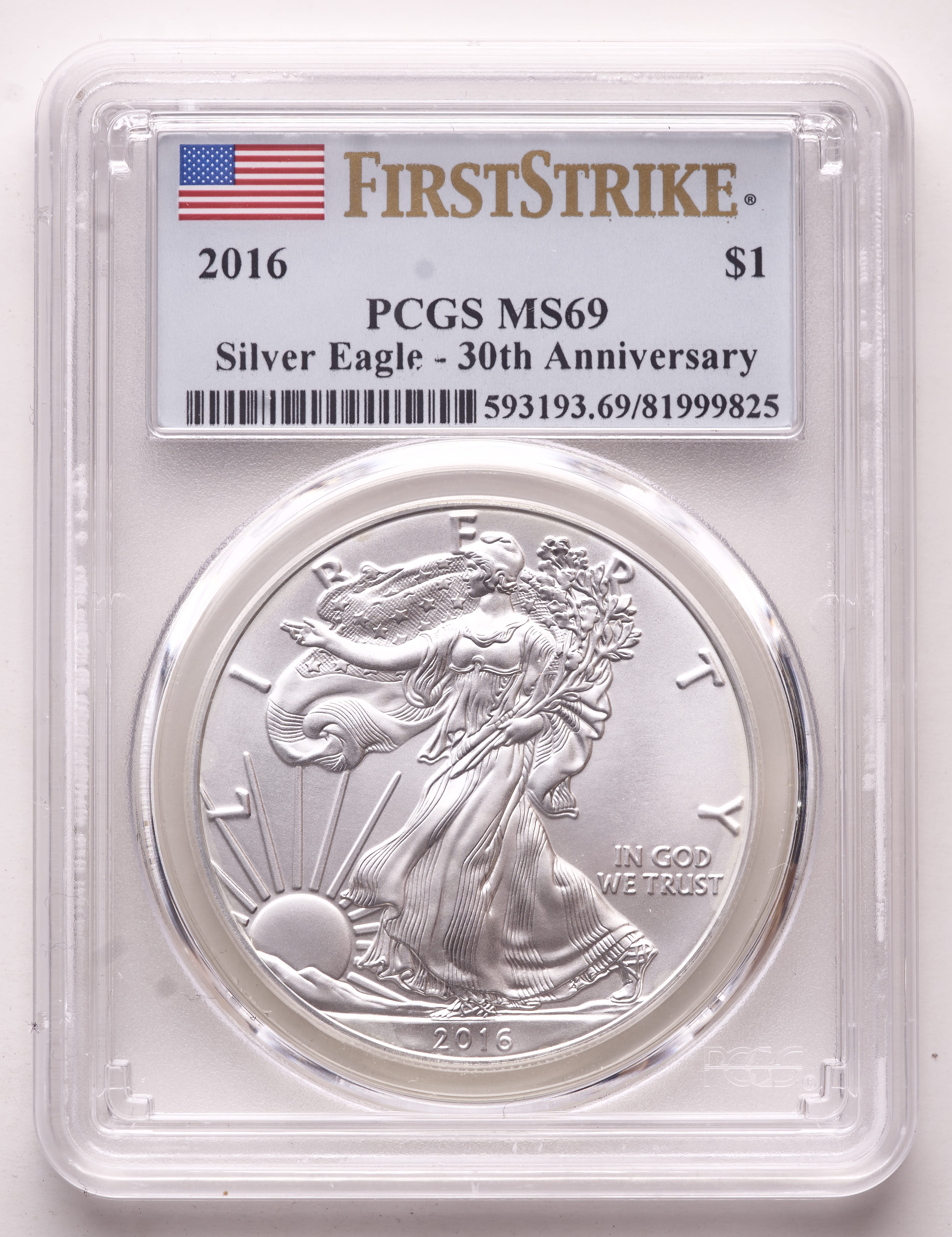 2016 American Silver Eagle $1 One Dollar Coin - First Strike, 30th Anniversary (PCGS MS69)