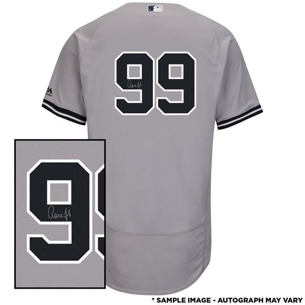 Majestic Authentic on-field style jersey. Everything sewn on, size XL. Hand-signed in silver paint pen by Aaron Judge.
