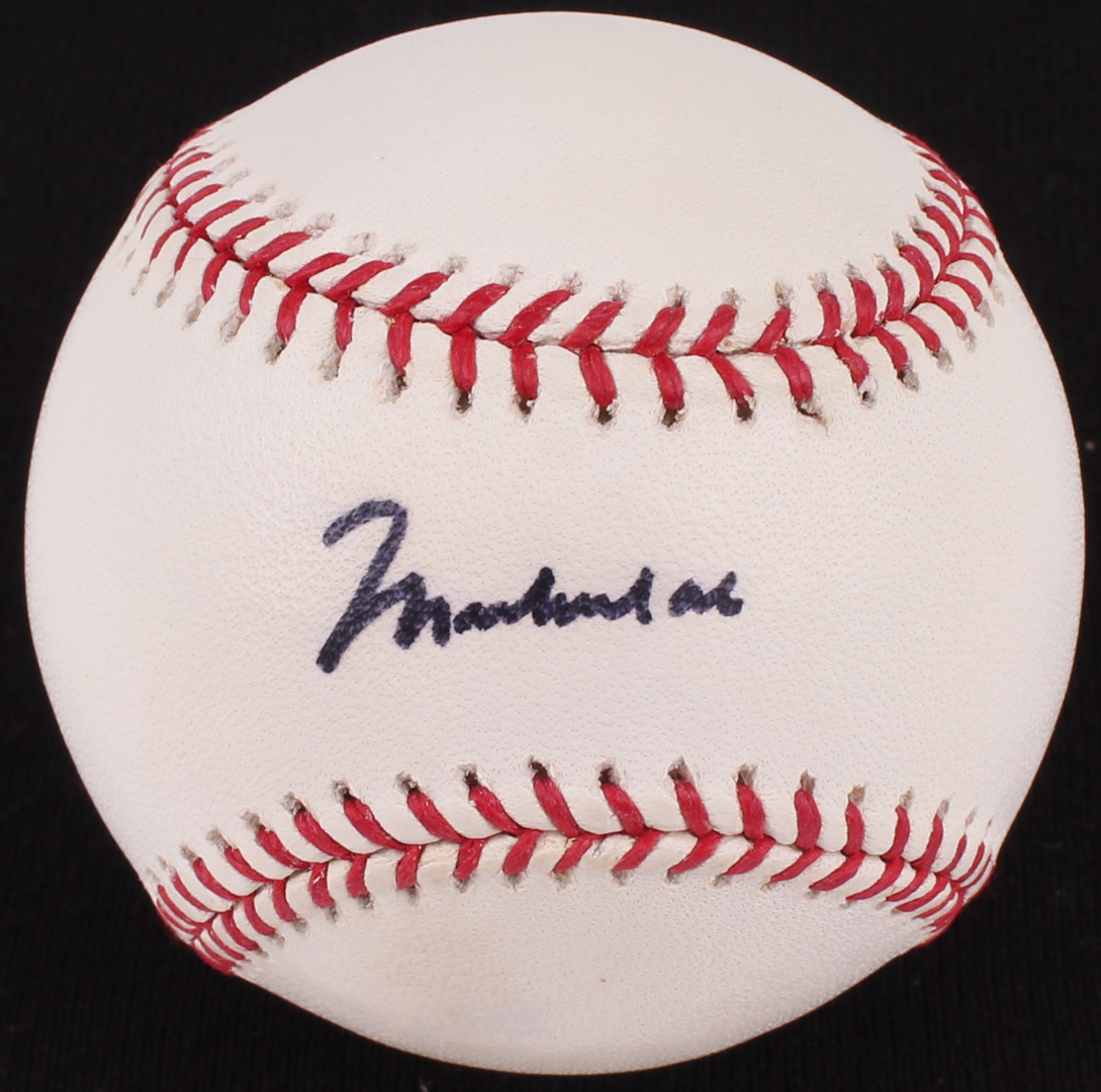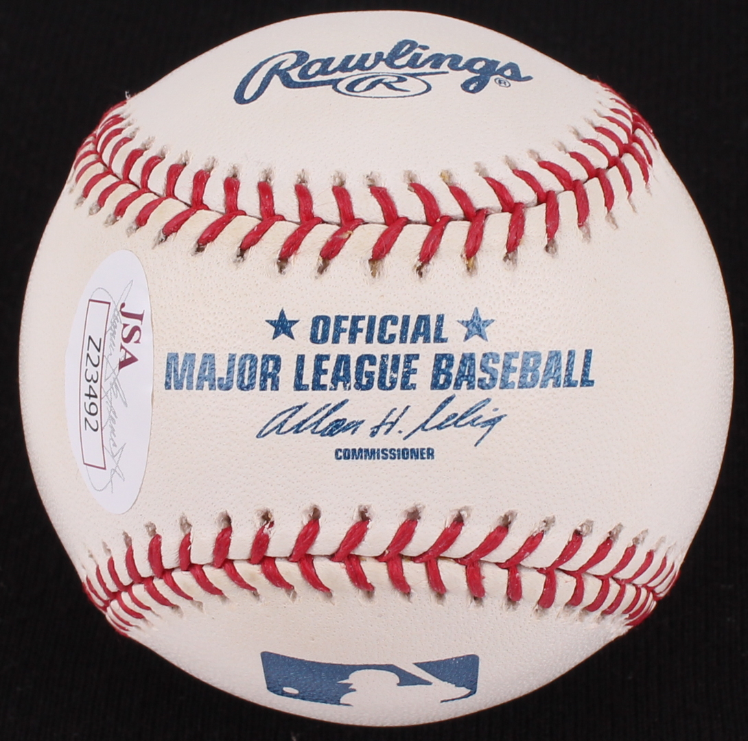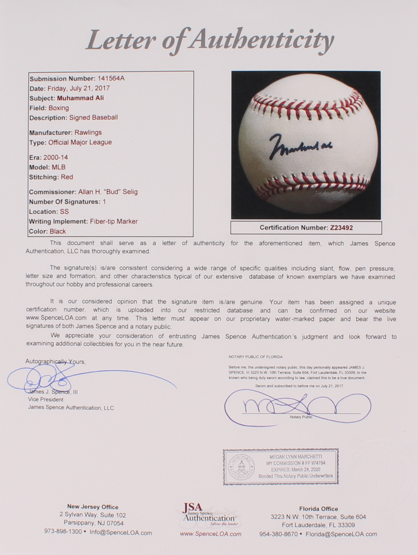 Rawlings Official Major League baseball has been hand-signed in black felt-tip pen by Muhammad Ali (HOF, D 2016). Please note, baseball has slight staining.