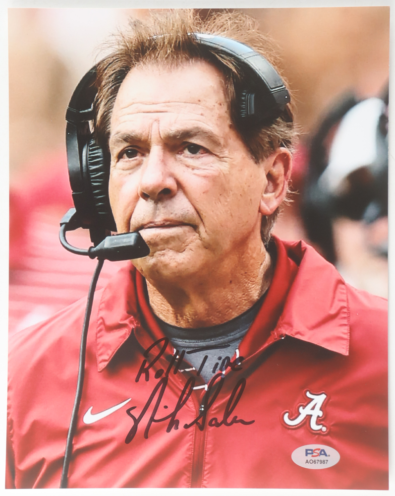Photo measures 8" x 10" in size and has been hand-signed and inscribed by Nick Saban.
