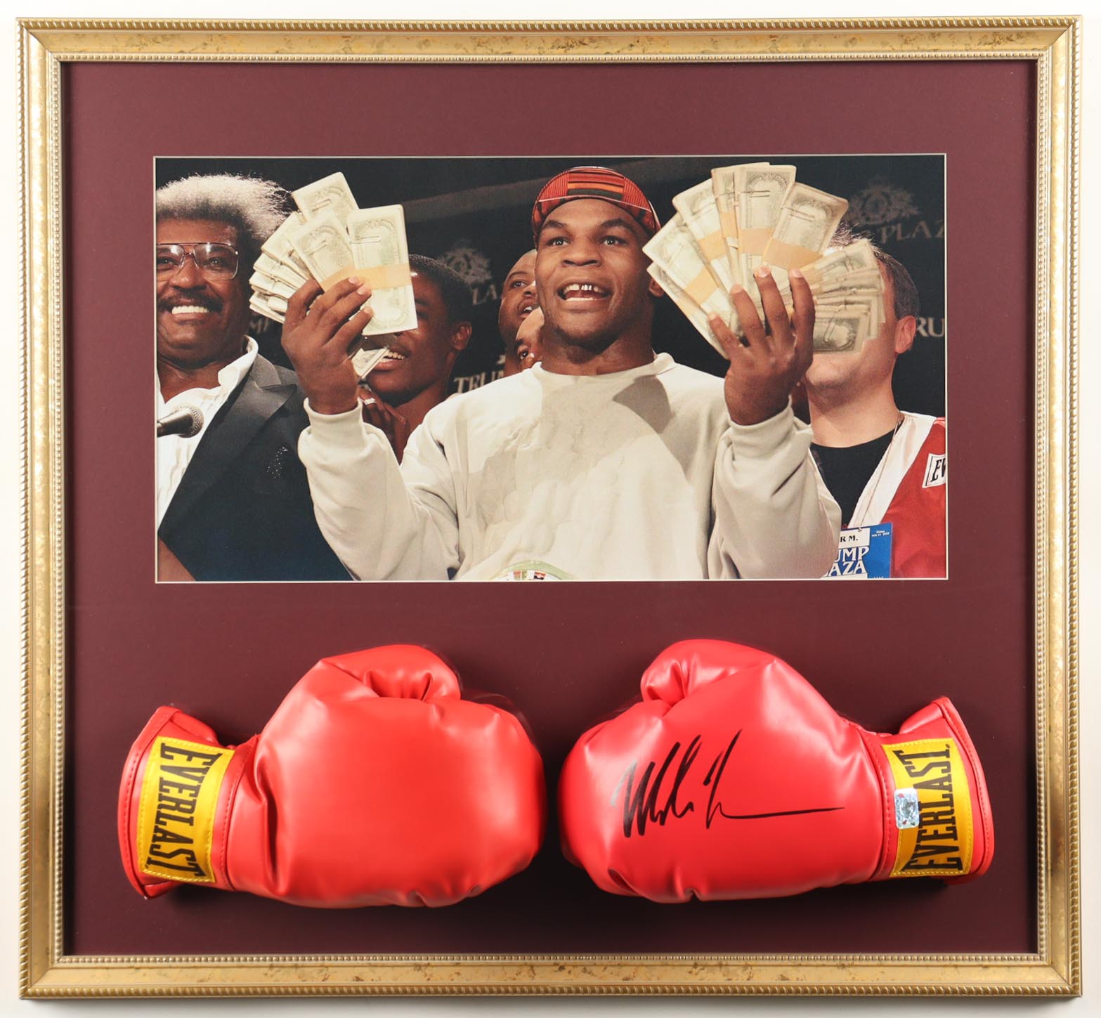 Custom frame measures 25" x 24" in size and features (2) Everlast boxing glove that has been hand-signed by Mike Tyson (HOF). Please note, the photo is unsigned.
