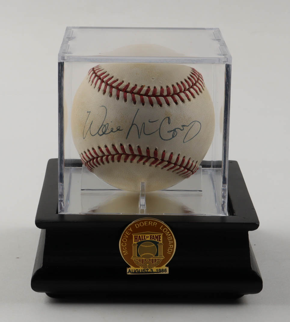 Rawlings Official National League baseball. Hand-signed by Willie McCovey (D. 2018, San Fransisco Giants, HOF). Please note ball is naturally toned. Also includes Display case as shown.