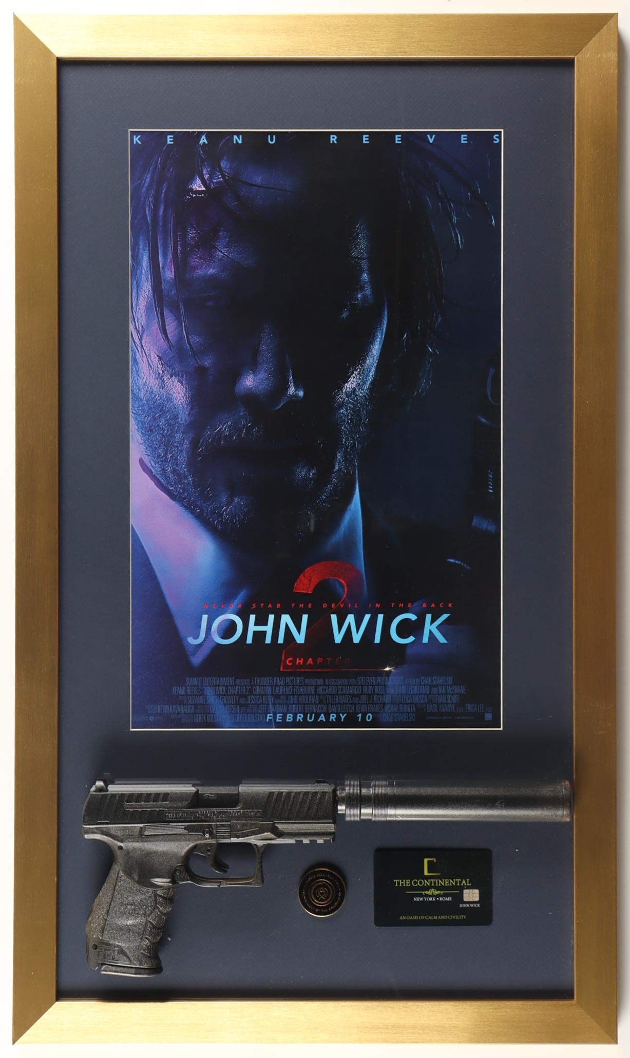 "John Wick Chapter 2" Custom Framed Movie Poster Display with Continental Hotel Key Card, Black Adjudicator Coin & Replica Prop Pistol