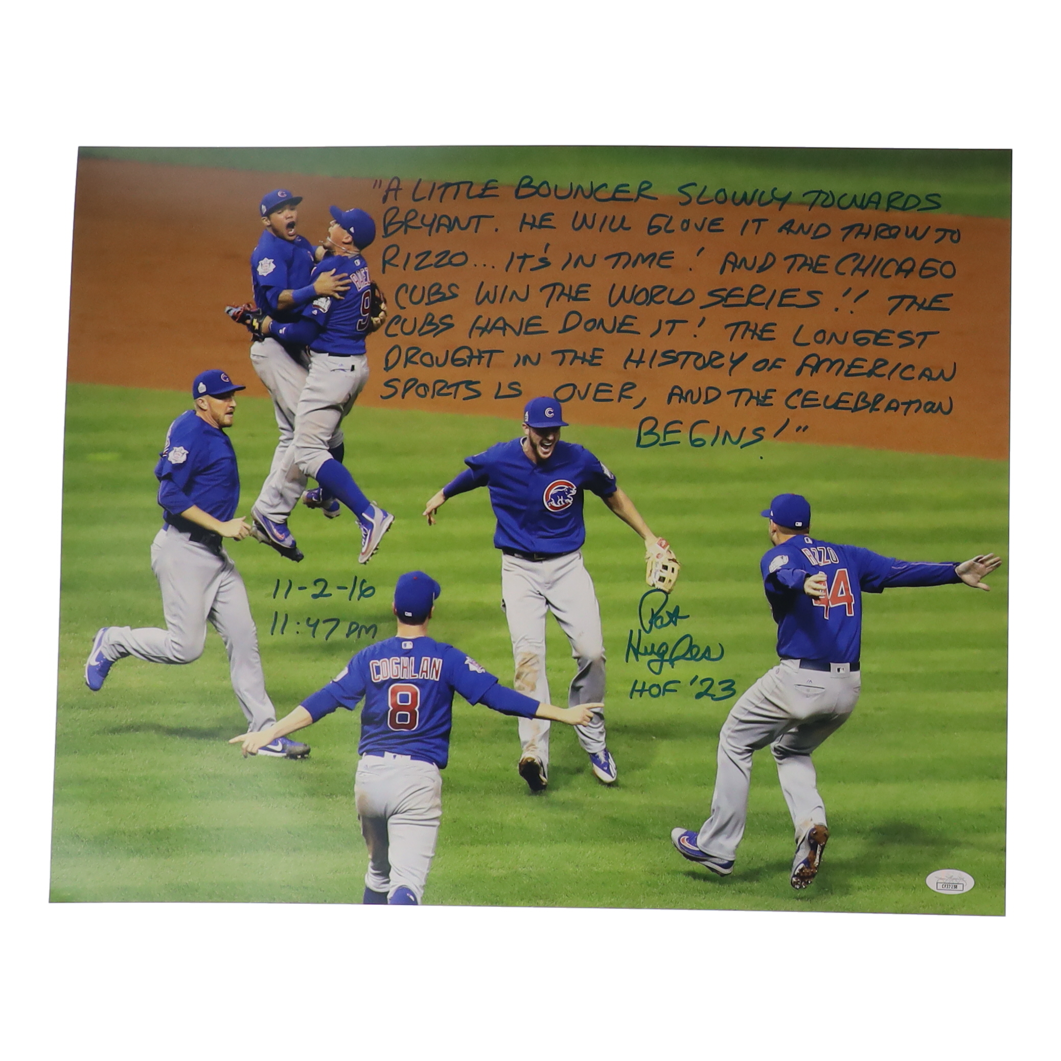 Pat Hughes Signed Cubs 16x20 Photo with Extensive Inscription (JSA)
