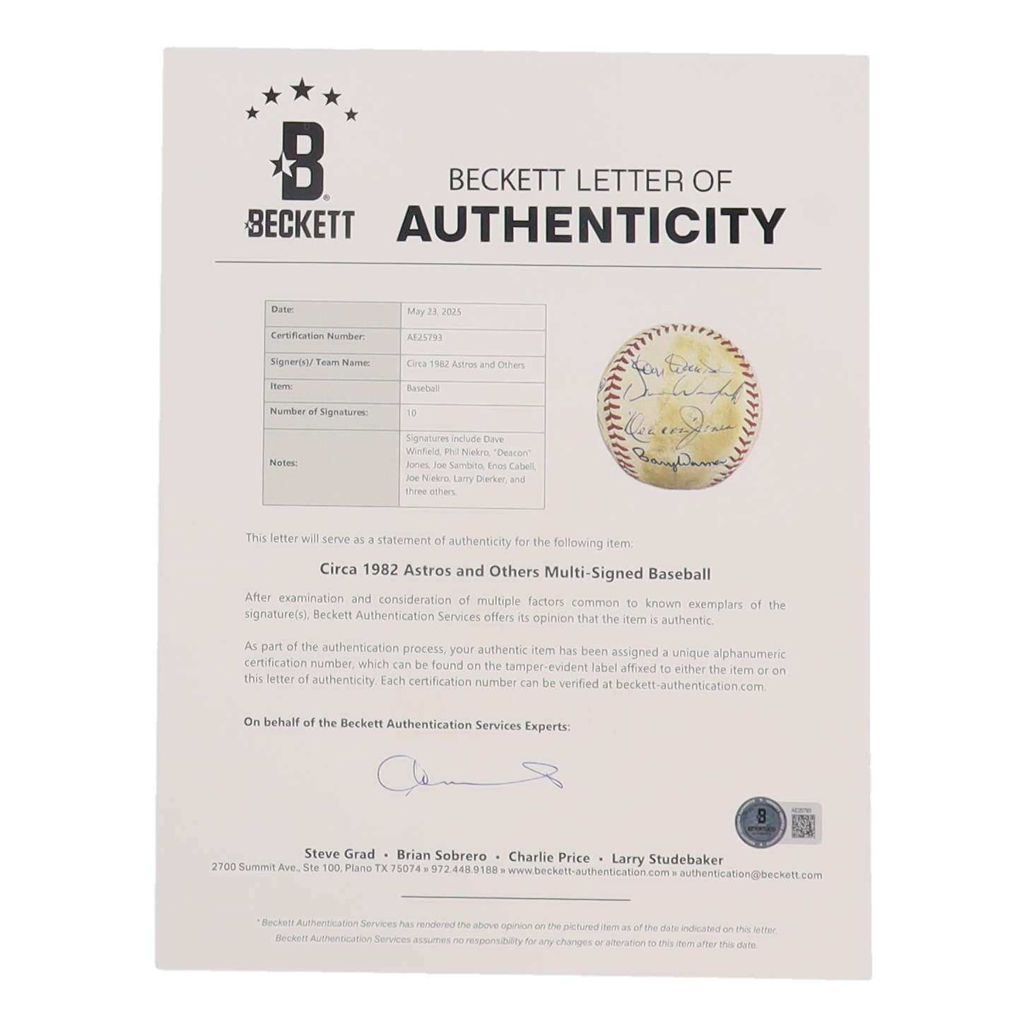 1982 Astros ONL Baseball Signed By (10) Including Dave Winfield & Joe Sambito (Beckett)