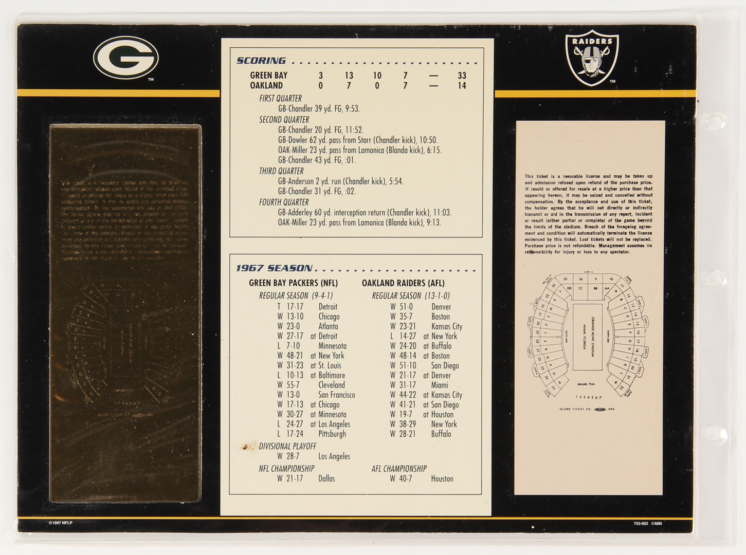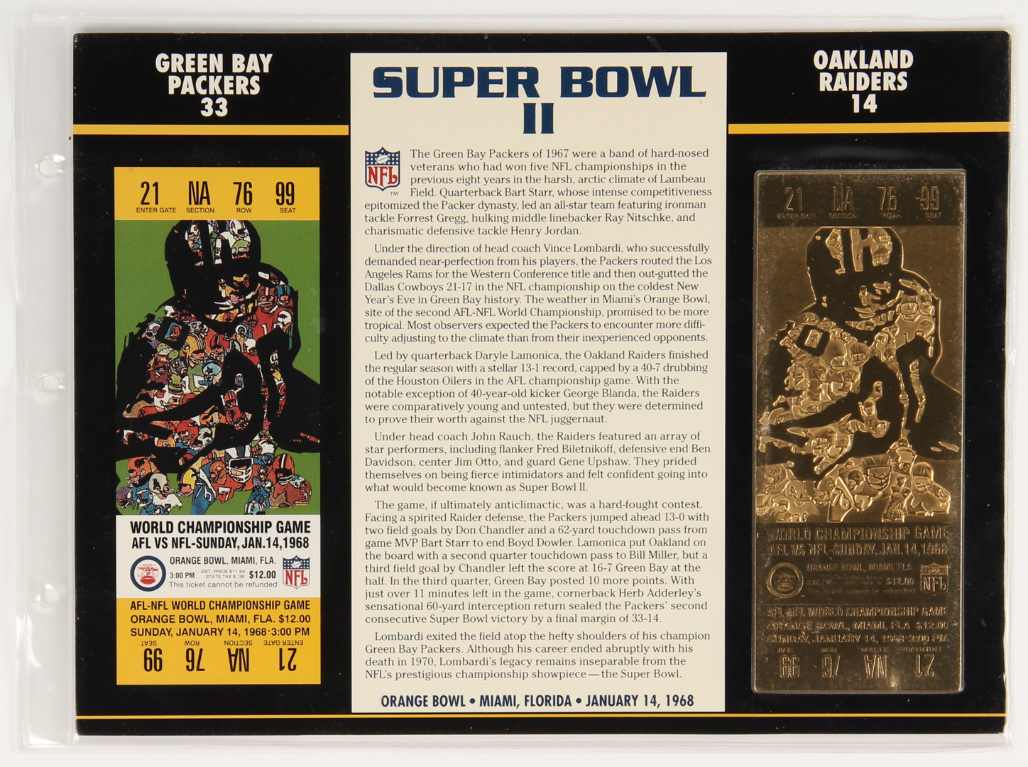 Commemorative Super Bowl II Score Card With 22kt Gold Ticket: Packers vs Raiders