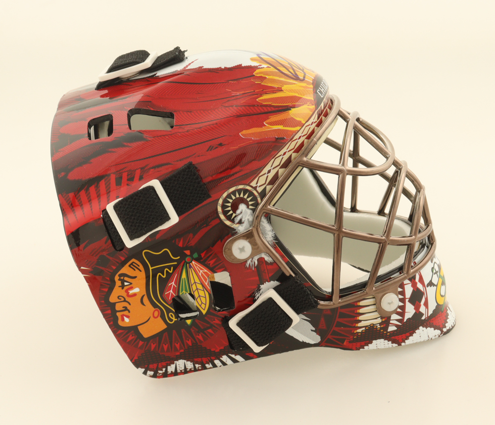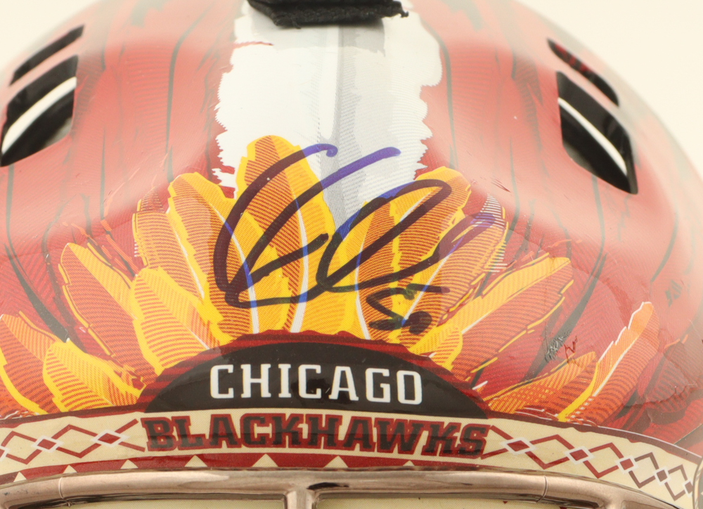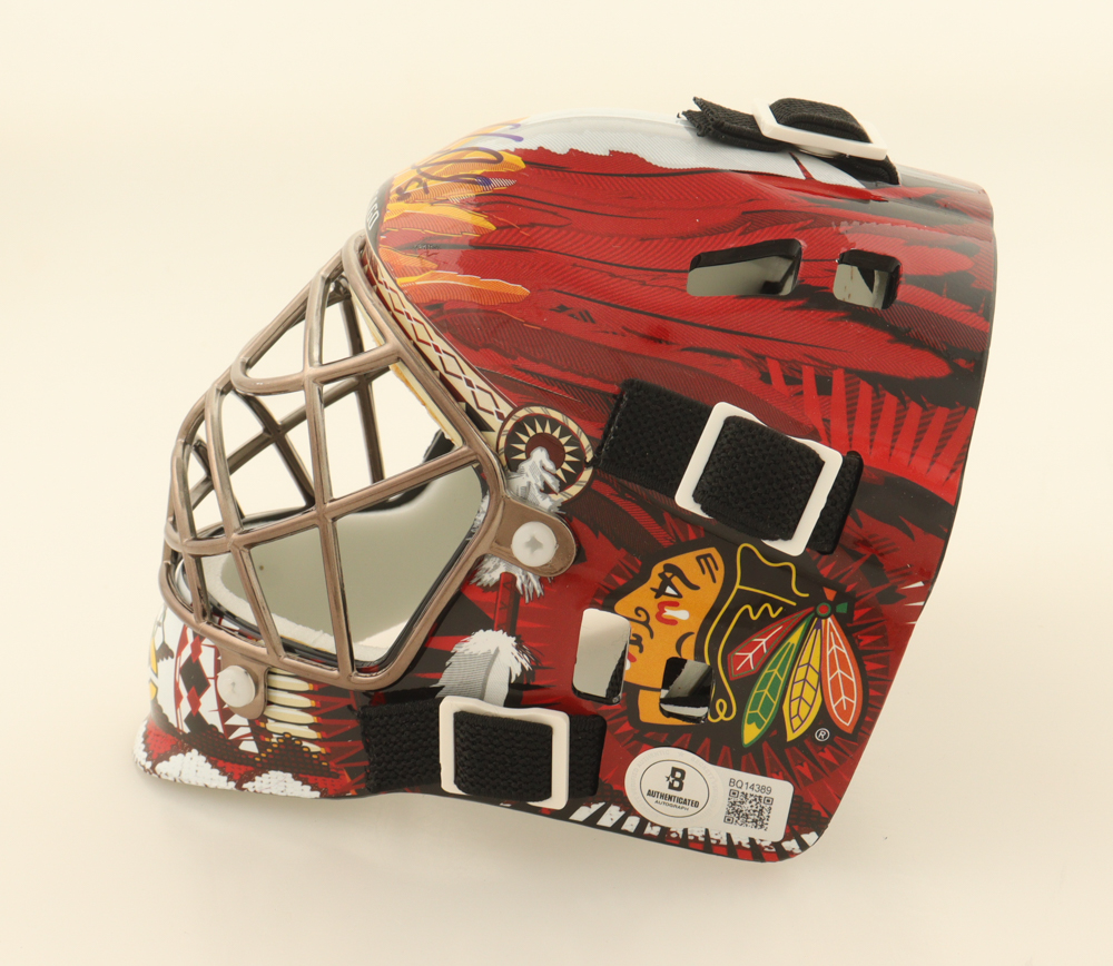Chicago Blackhawks mini goalie helmet. Hand-signed by Corey Crawford.