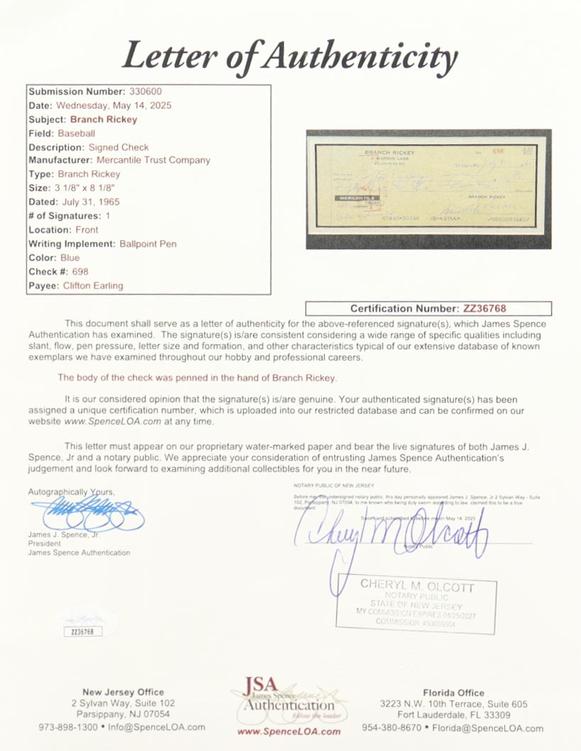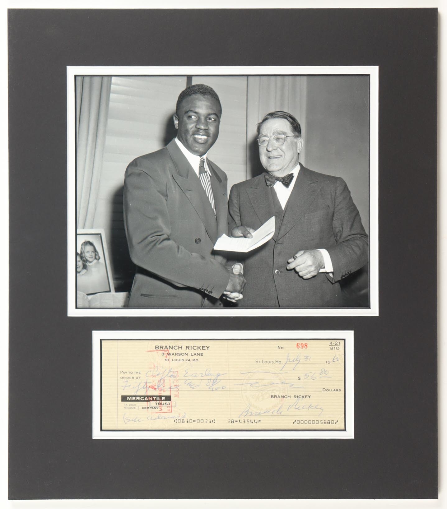 Custom matted display measures 14" x 16". Personal bank check of Mercantile St. Louis Missouri Trust Company dated 1965. Hand-signed by Branch Rickey (D. 1965, Brooklyn Dodgers).
