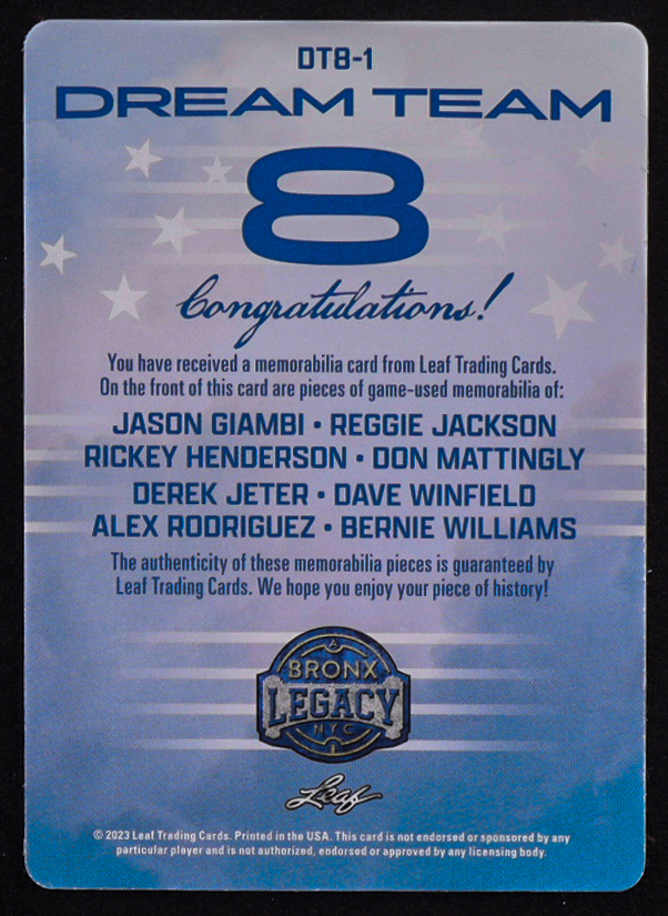Jason Giambi / Reggie Jackson / Rickey Henderson / Don Mattingly / Derek Jeter / Dave Winfield / Alex Rodriguez / Bernie Williams 2023 Leaf Bronx Legacy Dream Team 8 Printing Plate Black #DT8-1 #1/1