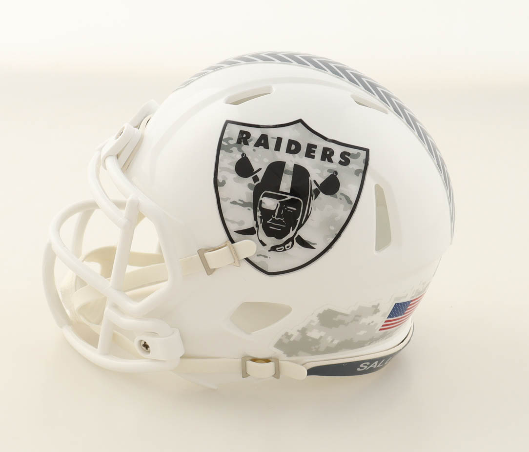 Riddell Las Vegas Raiders Salute To Service Alternate speed mini helmet. Hand-signed by Raheem Mostert.