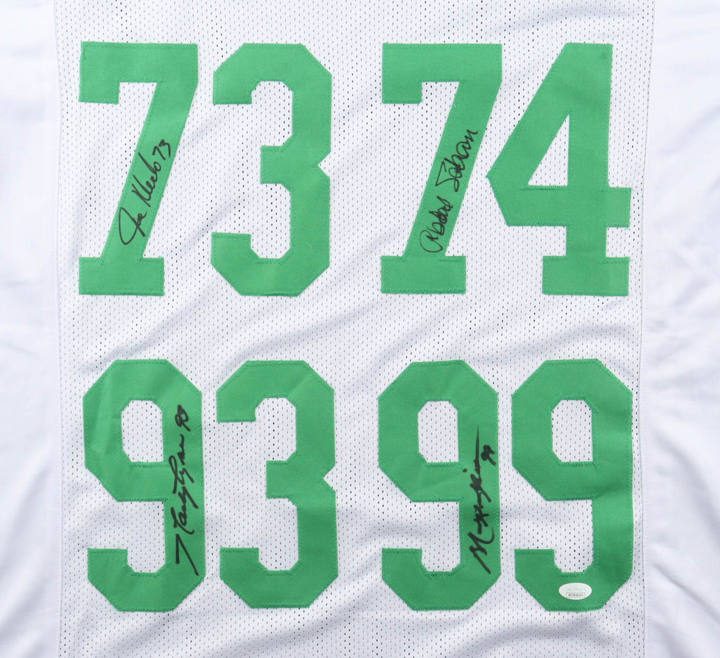 Custom jersey with everything sewn on, size XL. Hand-signed by Joe Klecko, Abdul Salaam, Mark Gastineau and Marty Lyons.