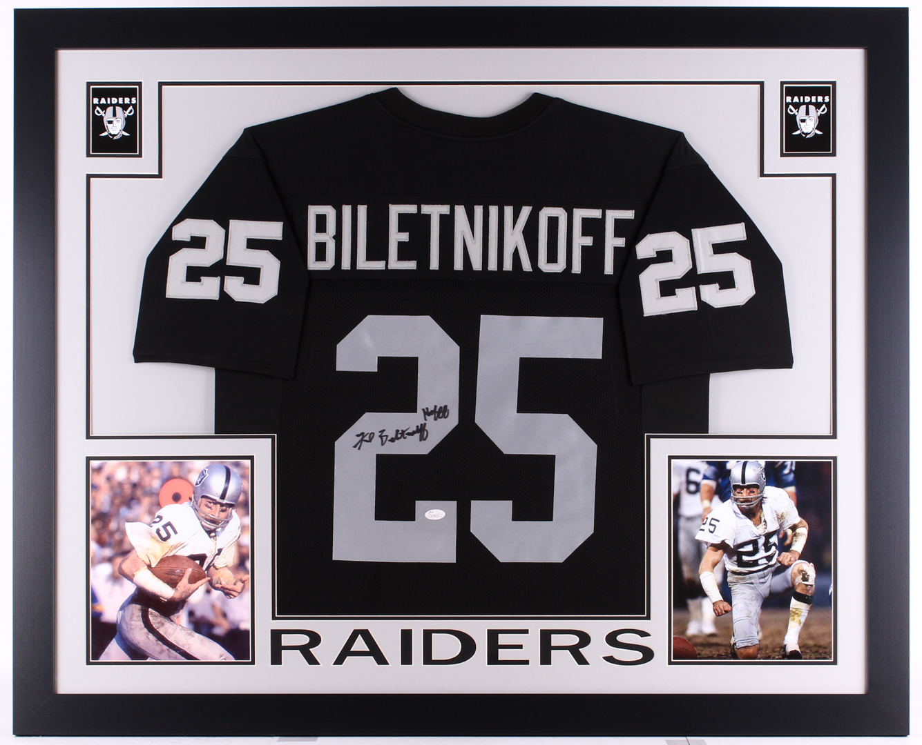 Custom frame measures approximately 35" x 43" in size and features a jersey which has been hand-signed and inscribed in black felt tip pen by Fred Biletnikoff (HOF).