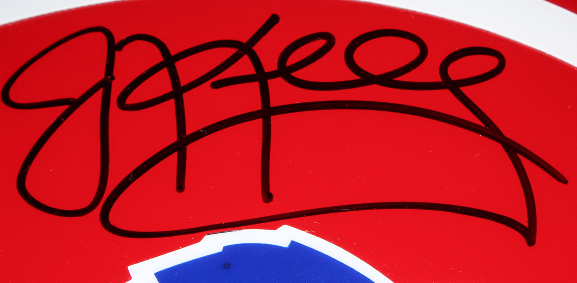 Buffalo Bills full-size replica helmet. Hand-signed in black felt-tip pen by Jim Kelly (HOF). Please note, helmet has minor surface damage.