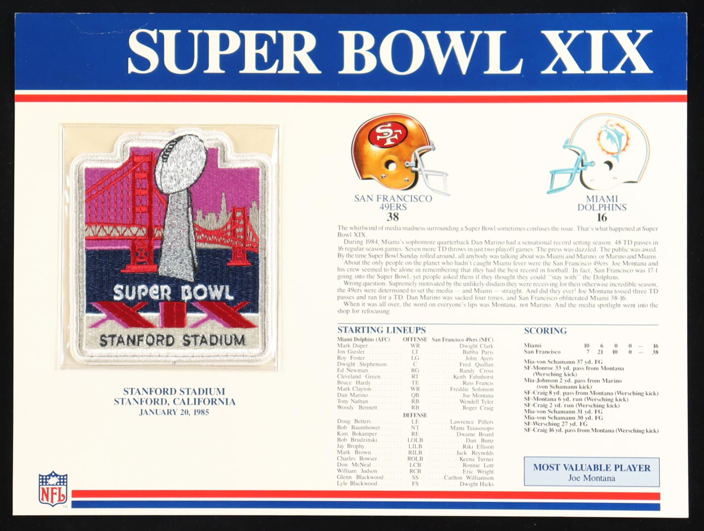 Super Bowl XIX Patch on 9x12 Stat Card