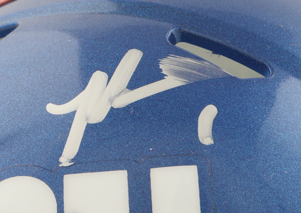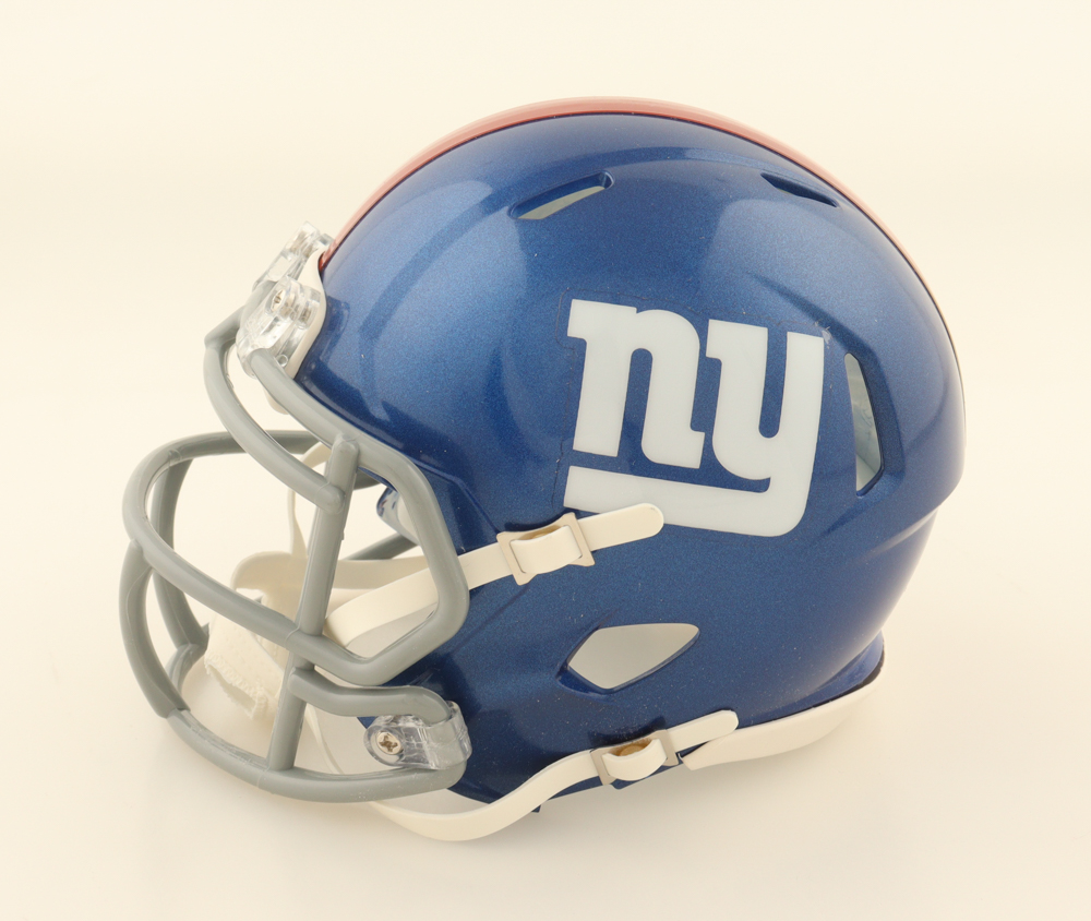 Riddell New York Giants speed mini helmet has been hand-signed by Malik Nabers. Please note, the autograph is smudged.