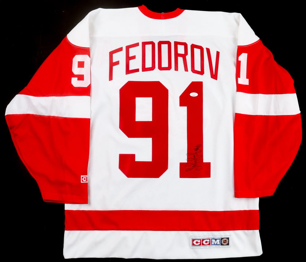 CCM jersey with everything sewn on, size L. Hand-signed by Sergei Fedorov (Detroit Red Wings, HOF).