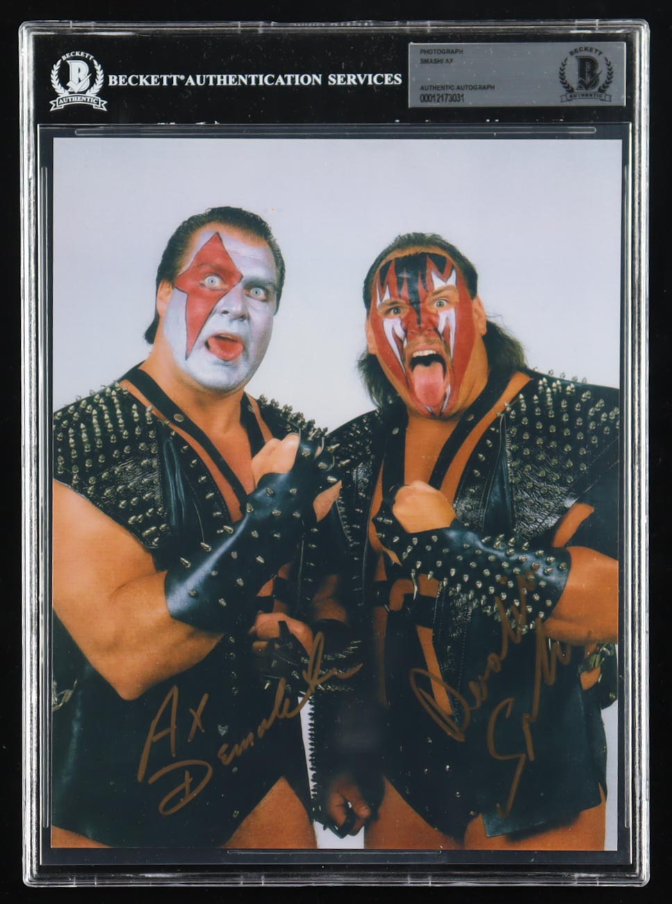 Photo measures approximately 8" x 10" in size and has been hand-signed by Smash and Ax. Please see photos for more details regarding the condition of the card.